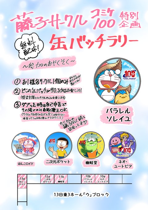 【夏コミ情報】コミケ100回記念・缶バッチプレゼント! とりかさん主催の藤子サークル合同企画に #パラレルソレイユ も参加しております。藤子サークルを回って是非コンプしてください。弊サークルから用意している缶バッチはホログラム仕様の麦わらドラえもん&ピッポです。 #C100 #コミケ100