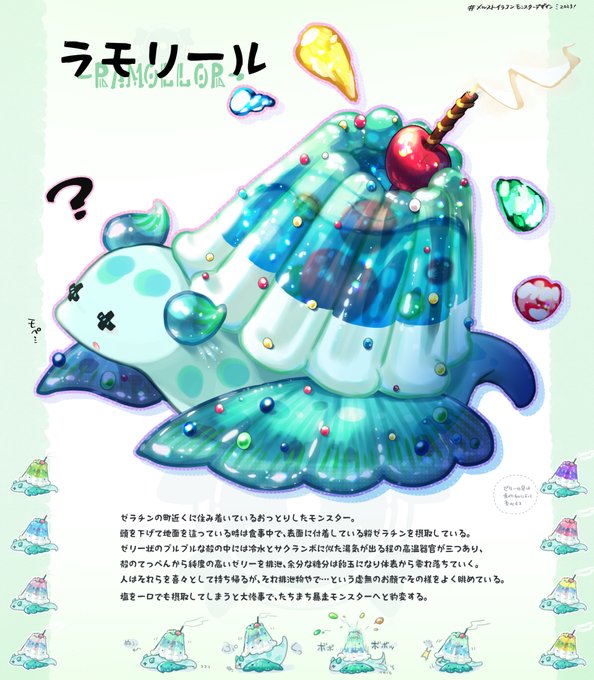 #メルストイラコンモンスターデザイン 今年も無事参加できました☺️㊗️9⃣㊗️ 気持ちは風属性な、ウミウシの様なカタツムリの様な…お菓子の国のモンスターです٩( 'ω' )و 通常はモペモペ、お腹が減るとモトゥ…、ご機嫌斜めはモルルルと唸りますが、そもそもあまり鳴かないご様子(✚-✚)