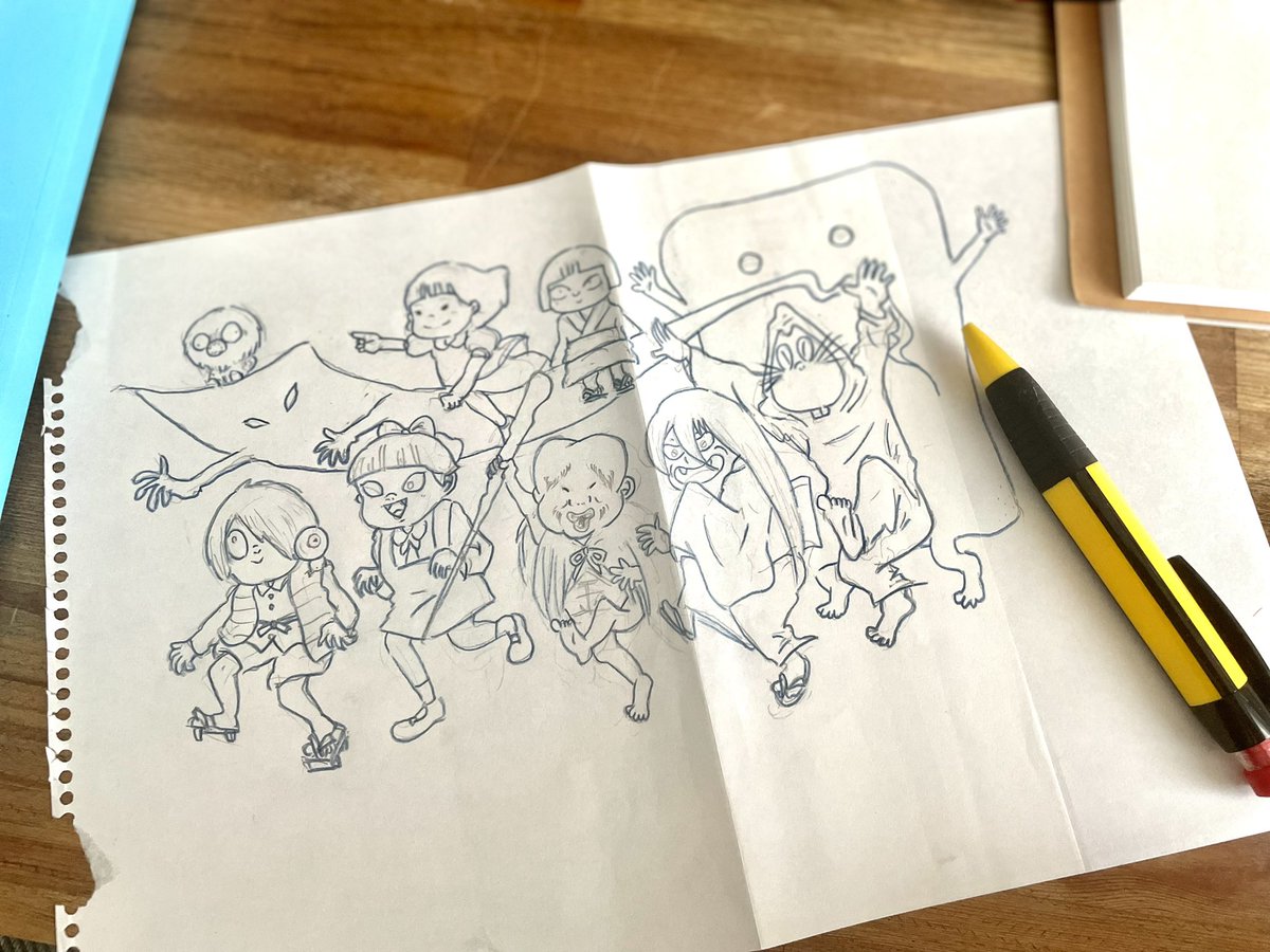0 24 机の整理してて むかし、妖怪好きなお子さんがいるお友達が、どうしても娘に一反木綿に乗っている絵を描いて欲しいって言われて描いた時の下描き出てきた… 水木しげる好きは、こうなるのですよ😇 ちなみに一反木綿の上で指さしてる子が友達の娘さん、隣は座敷わらしw #イラスト #最近鉛筆描き再来 22/08/16 09:06