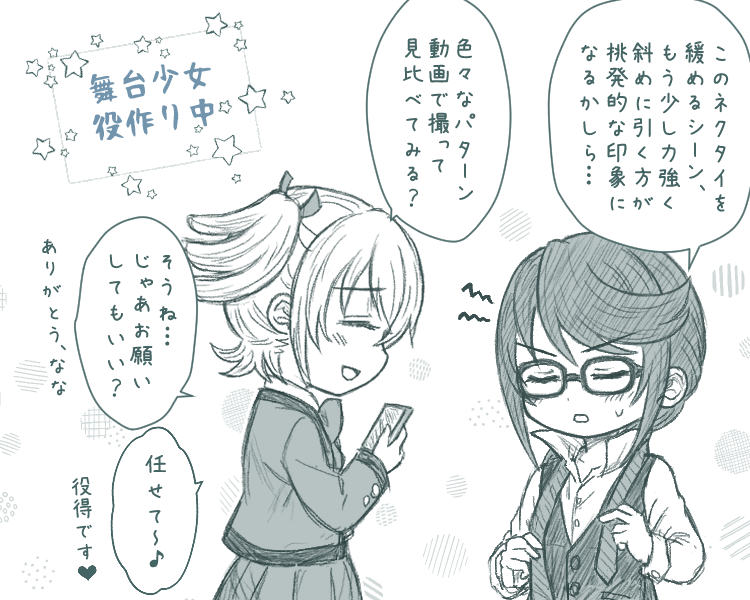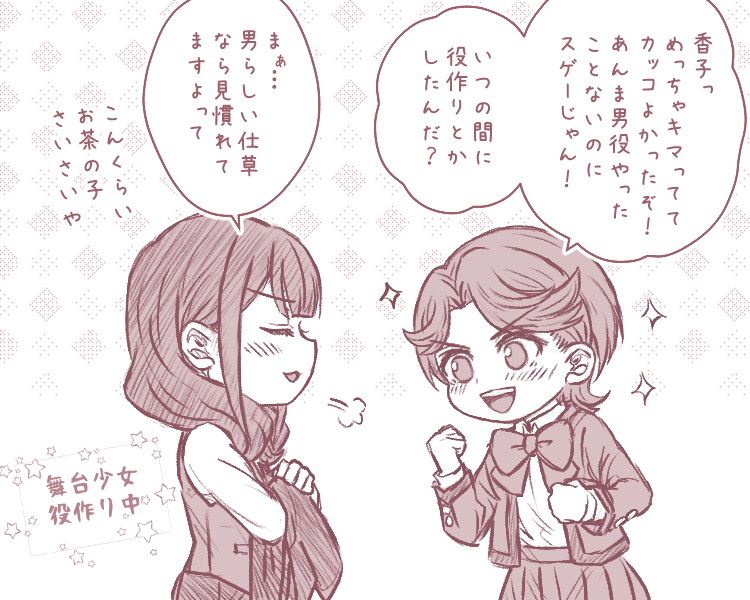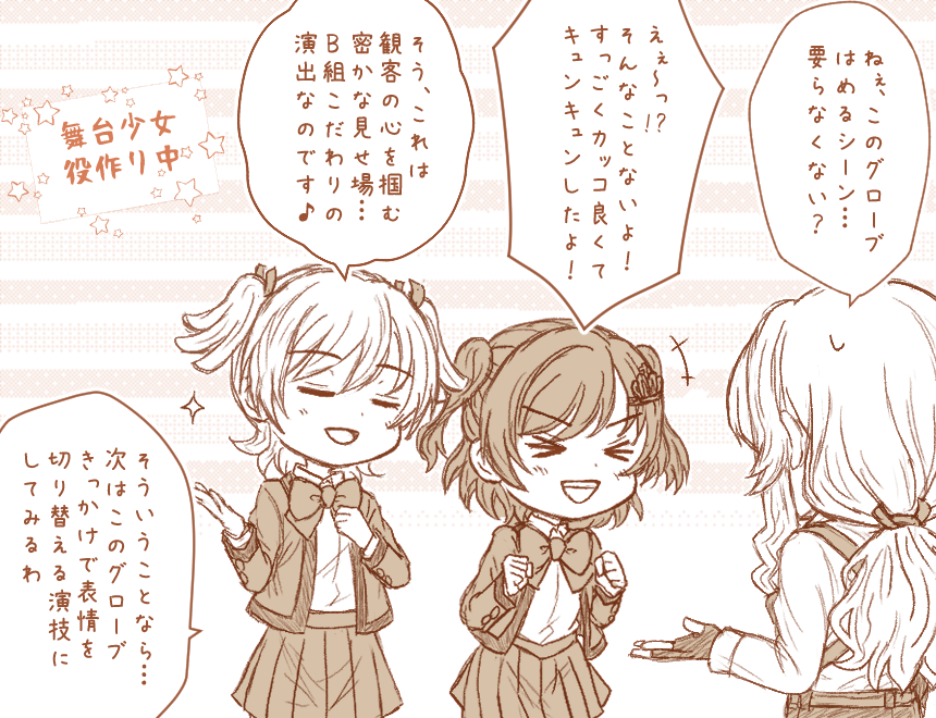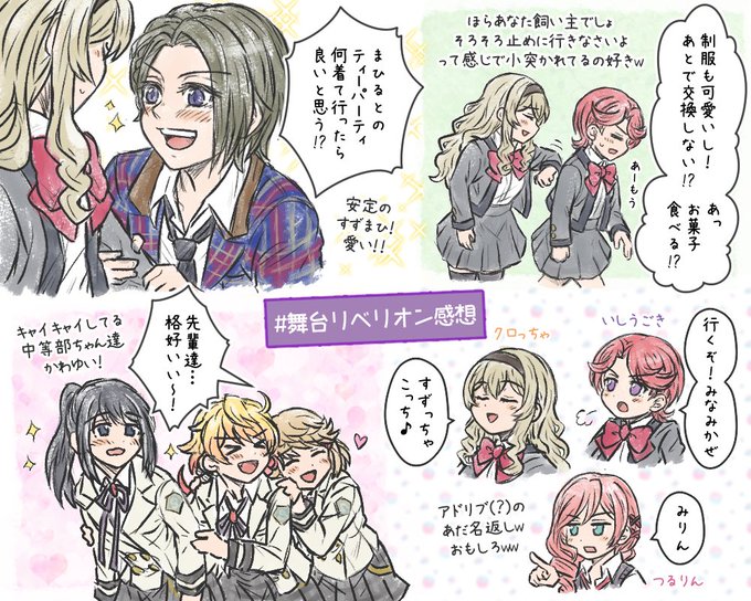 #舞台リベリオン感想 中等部舞台の好きシーン詰め! ~以下、描ききれなかった感想(抜粋)~ ・やちよの「雷落とされちゃいそうですけど〜」の後ろでお互いのおヘソを隠してる良子とみんく可愛いw ・みんくだけじゃなくてステラと良子もクイクイ〜!イジりしてるの好…愛され委員長になっとるぅ