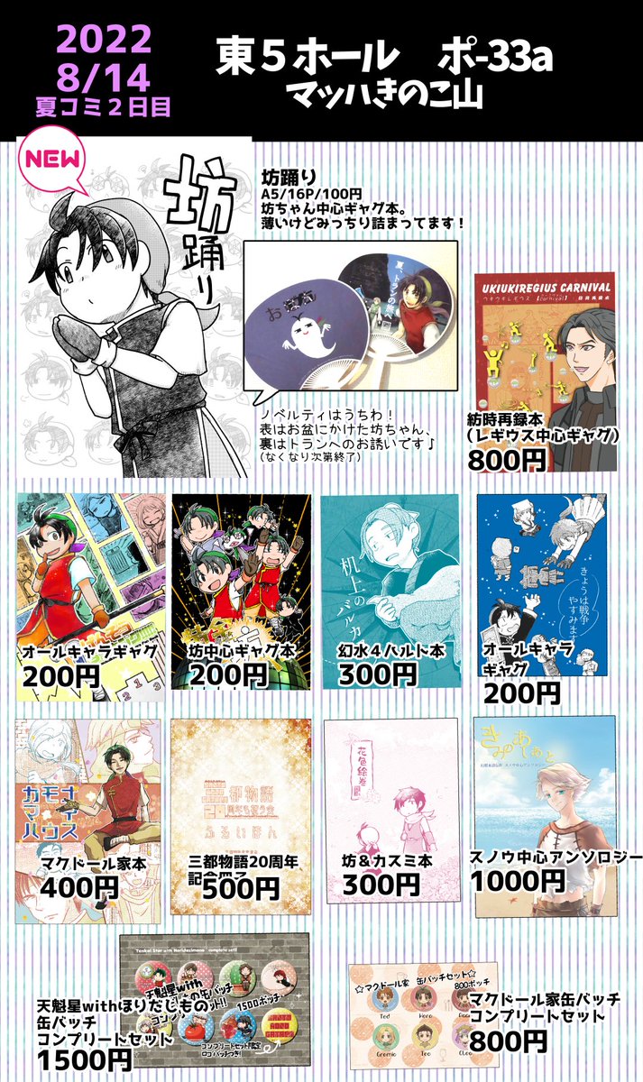 18 23 #C100お品書き 明日ご参加の皆様宜しくお願いいたします〜!!!! 新刊は突発ペラペラ6坊本ギャグ「坊踊り」!! 2枚目がサンプルになります。 先着で裏表の温度差で風邪ひきそうなうちわがつきます! 東ポ33a マッハきのこ山 アンソロへの誘いポストカードも配布中! お待ちしてま〜〜〜す😆 22/08/13 14:55