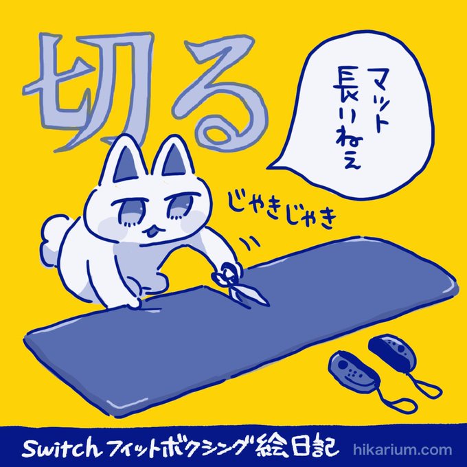 【 #フィットボクシング絵日記 】 14日目。今まで薄めのヨガマット敷いてたけど、10mmの分厚いトレーニングマットに変えたら動きやすくなった!踏み心地もちもちで全然足痛くならない!すごい! でも分厚い上に長くて収納が大変だから半分にカットしちゃった✌️いいのか?