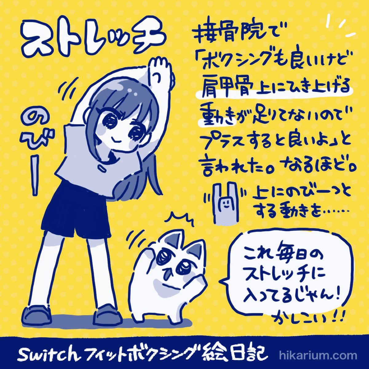 【 #フィットボクシング絵日記 】 11日目。続いてる🎉 選択メニューにある「しっかりストレッチ」が好きです。肩まわりがごりごり鳴って肩甲骨が動く感じする。 えっこのストレッチ映像が10キャラ分あるの?すごくない?飽きないじゃん! #FitBoxing2 #フィットボクシング