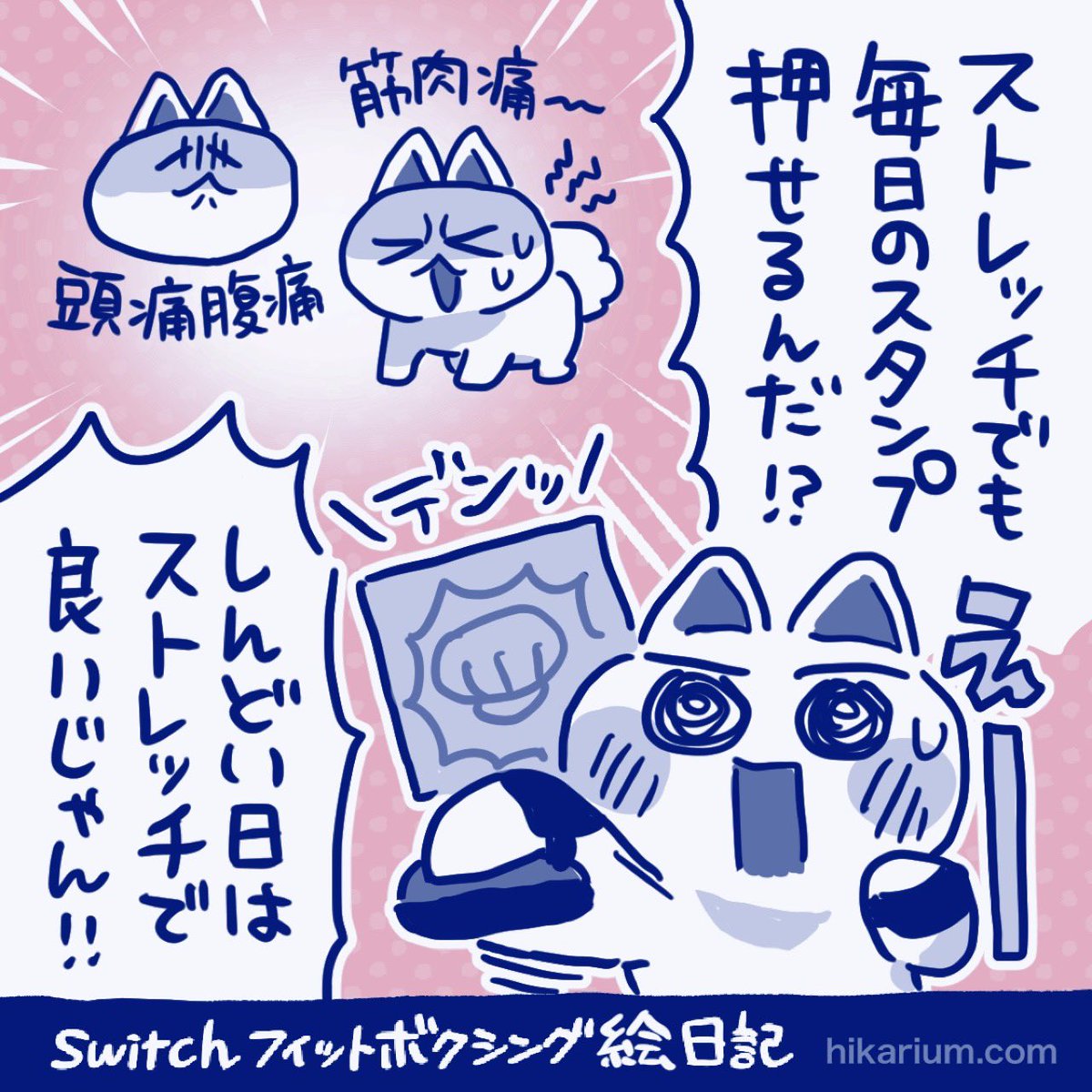 【 #フィットボクシング絵日記 】 12日目。気圧で頭痛が…今日どうしよ…ひとまずストレッチやってから考えよ…と始めたけど、これでも日付のスタンプ押せるんだ!ボクシングしないと押せないと思ってた! ストレッチしたら気分良くなったので軽いメニューも出来た💪 #FitBoxing2 #フィットボクシング