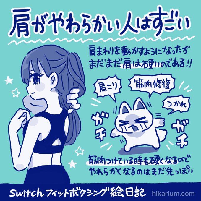 【 #フィットボクシング絵日記 】 13日目。肩が柔らかい人はすごい。 私は肩を動かせば肩のガチガチが無くなると思っていた。 実際は「コリ」「筋肉の繊維修復」「疲れ・ストレス」などいろんな要因で硬くなる。全部解消し筋肉が定着してから真の柔らか肩となるのだ💪 #FitBoxing2 #フィットボクシング