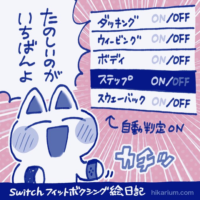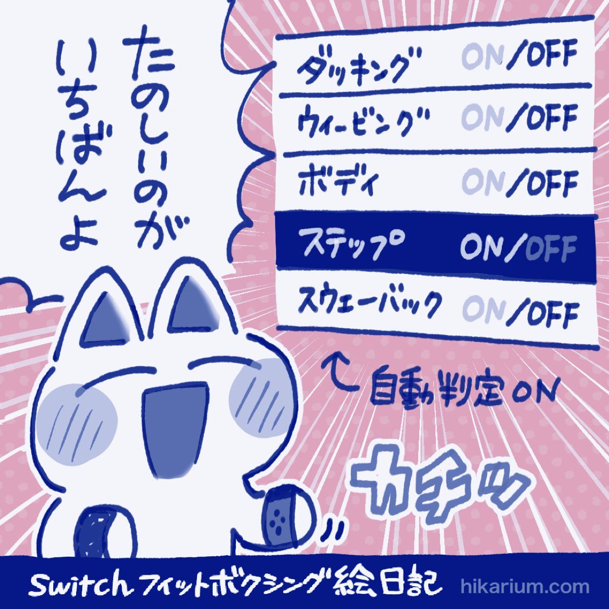 【 #フィットボクシング絵日記 】 18日目。ステップが少し上手くなったけど、相変わらず当たり判定にはならない。 このまま外れ続けるとテンションが落ちる一方なので、アクション補助機能をON(自動でJUSTになる)にした。 無理せず楽しく続けることが大切よ! #FitBoxing2 #フィットボクシング