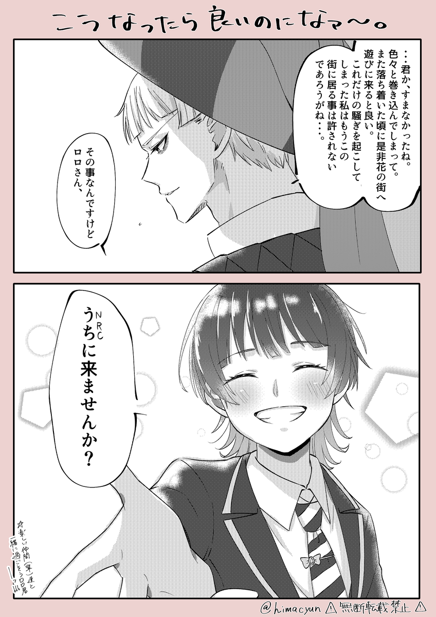 51 631 ロロ監🔔🌸(?)/顔有り監督生♀ 4章配信前に描き殴る!! グロマスの一連のトラブルが収まってNRC生達が学園に帰る前日の夜くらいにちょっと落ち込んじゃってるロロ君のとこ行ってこんな事にならんかな~っていう妄想。 #twstプラス 22/11/13 17:37