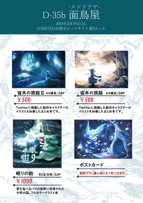 7 17 2/19(日) 東京ビッグサイトで開催されるコミティア143のお品書きになります。 今回も既刊のみになります;; 【D35b】にてお待ちしてます。 #COMITIA143 23/02/17 19:08