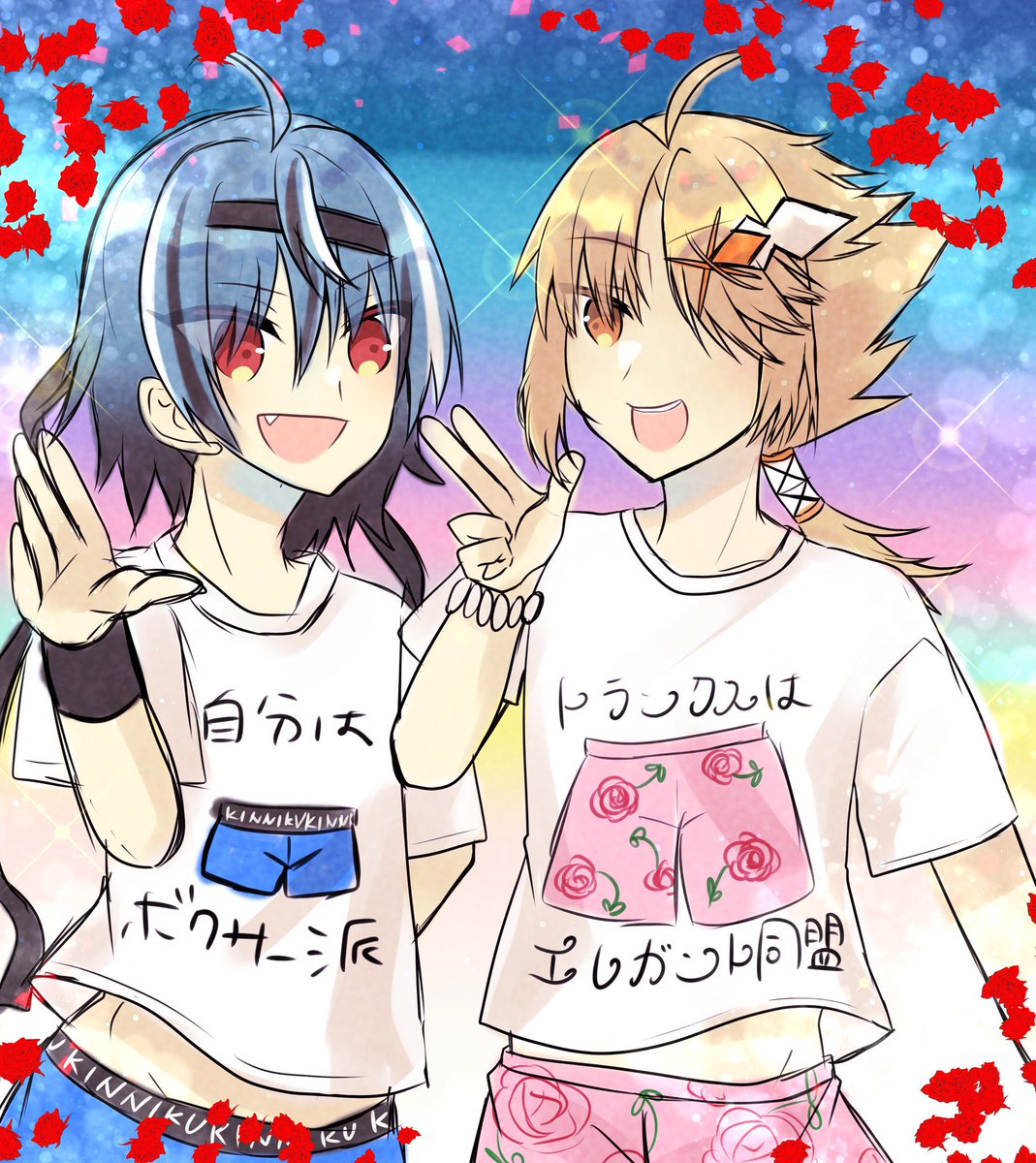 @limek0105 カスミさんこんにちは😃 ワンドロのお礼も兼ねて、ヤバT仲間嬉しくてつい描いてしまいました……🥲 全然時間足りなくて落書き状態で申し訳ないです…… 是非ヤタバネ様にはかおちゃんとヤバT着て語り合って欲しいです笑笑 2枚目はおまけで乱入してようとしているあかねです笑笑