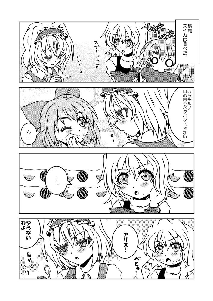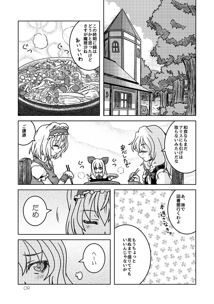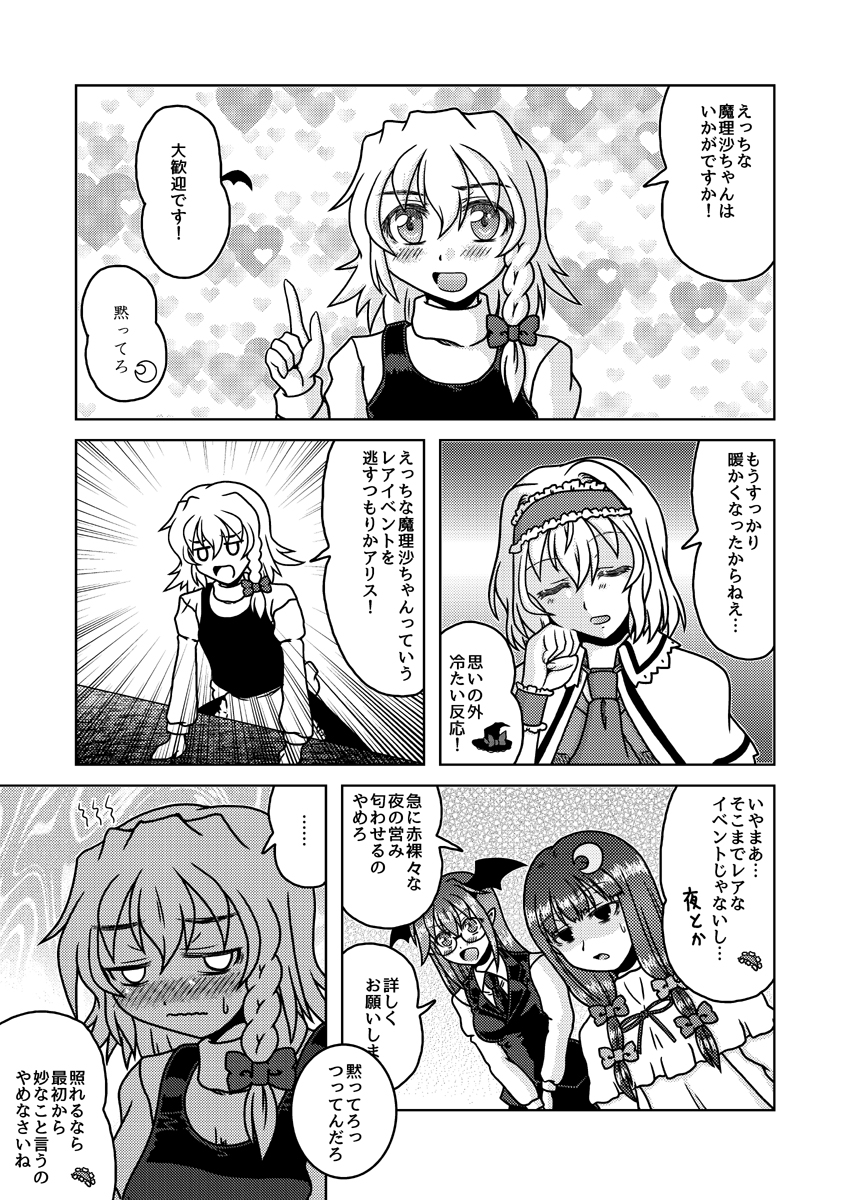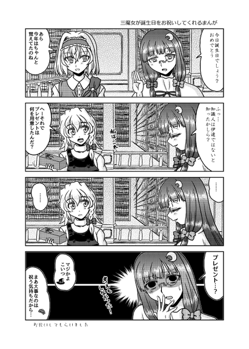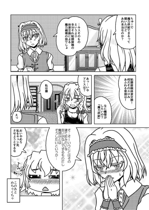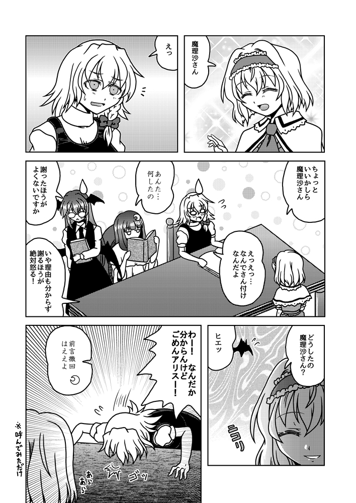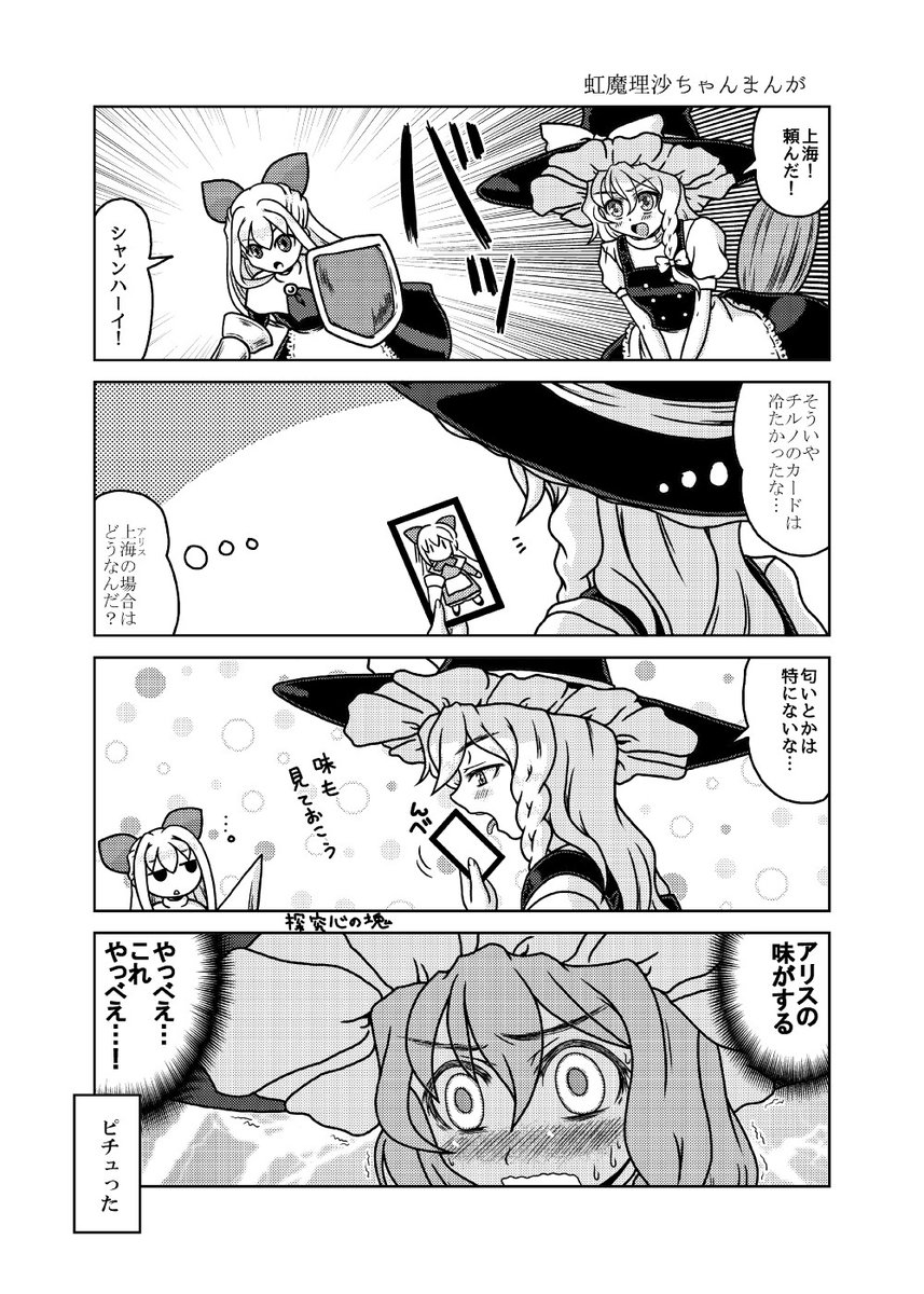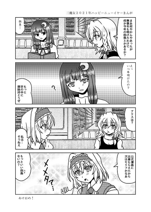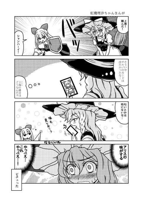 12月31日コミックマーケット99新刊「第一回三魔女頂上決定戦」のサンプルです。(1/2) アリスと魔理沙とパチュリーが魔法とか関係ないグダグダの争いを繰り広げたりする漫画です。たぶん。 2日目東6㍁サ48b"Fiesta de Caricatura"にて。 書店委託:melonbooks.co.jp/detail/detail.… #C99東方告知 #C99新刊
