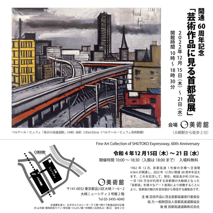 開通60周年記念「芸術作品に見る首都高展」 2022年12月15日(木)~12月21日(水) 営業時間:10:00~18:30 入場無料 O美術館 住所:〒141-0032 東京都品川区大崎1-6-2 大崎ニューシティ2号館2階 電話:03-3495-4040 JR 「大崎駅」(北改札口・東口)徒歩2分 shinagawa-culture.or.jp/o-art/access.h…