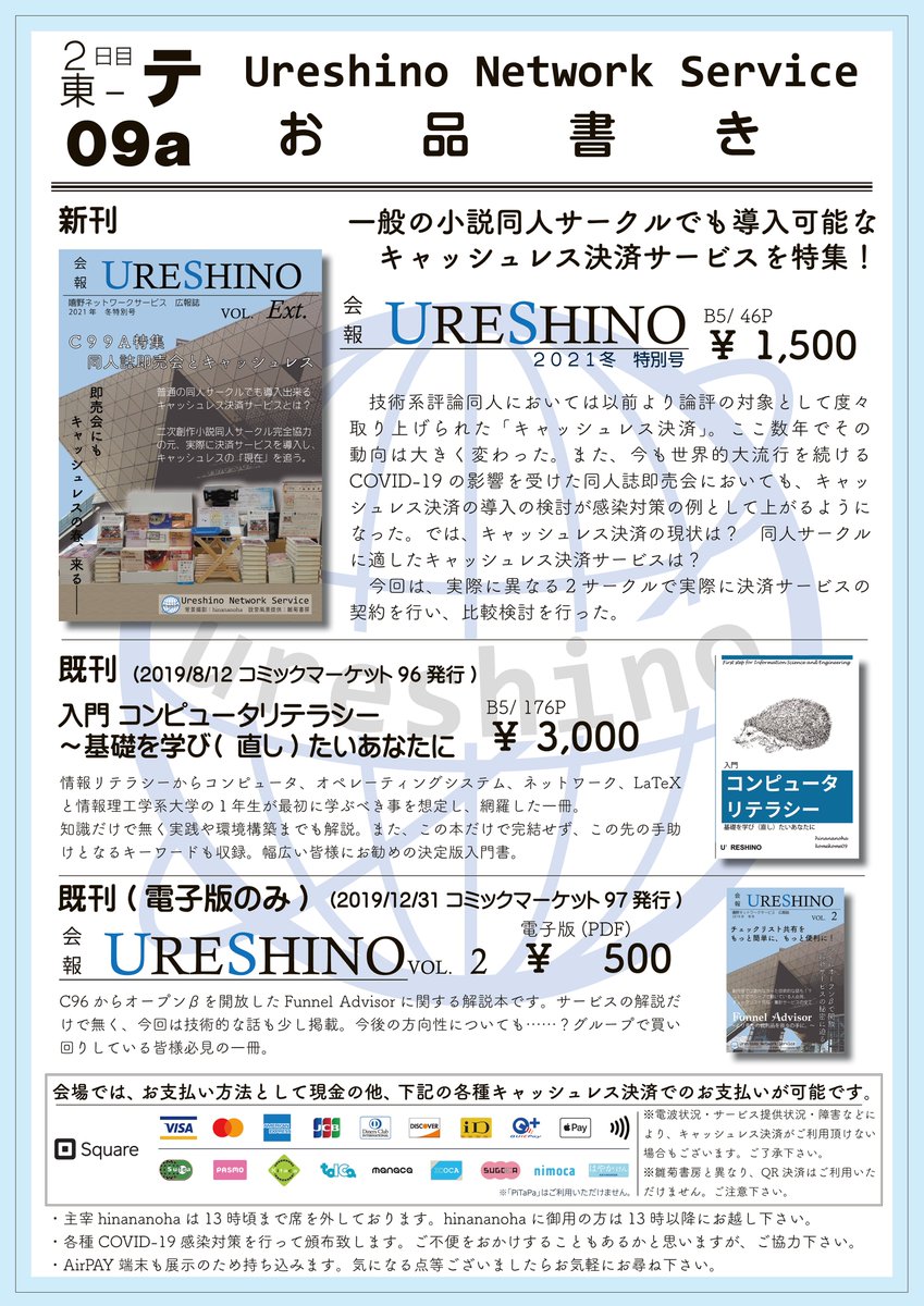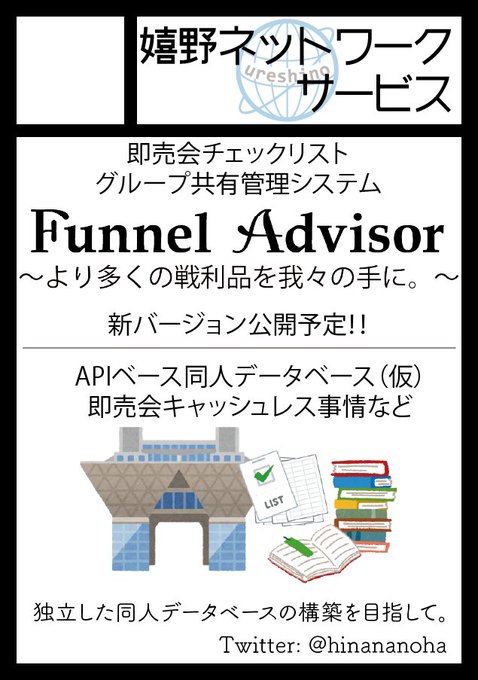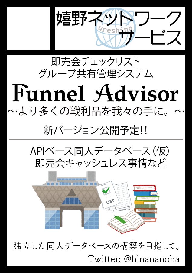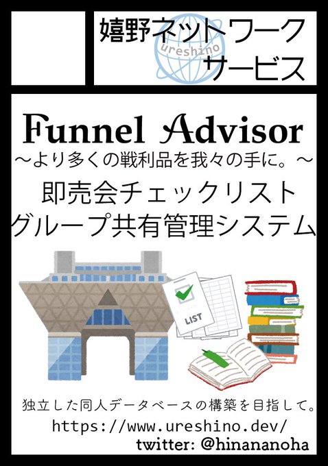 「嬉野ネットワークサービス」(1日目 西し-12a)のお品書きです。今回はFunnel Advisorのアップデートに関する話!コミケが中止となった2年間と、今後の展開についてお話しします! なお、キャッシュレスでのお支払いが可能です! webcatalog.circle.ms/Perma/Circle/1… #C100WebCatalog #C100 #C100お品書き