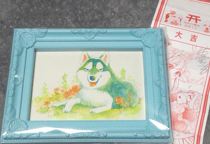 それでは #岐阜市イラスト展2022 4月19日火曜のくじ結果いっきまーす✨✨✨ぱふぱふどんどん← 先ずは由愛乃ナカ(@mihoni1027)さんのクジにて一発ゲット出ました大吉✨✨✨ 直筆ワンコ額入りイラストゲットです😍ワンコ凛々しいイケメンw ハロウィンバージョンもあったのですが先ずはこちらを💞