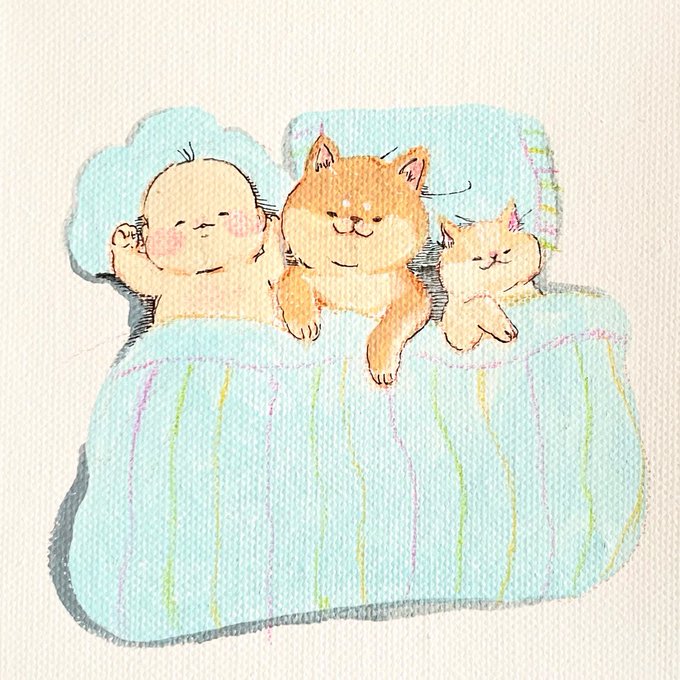 三兄弟👶🐶🐱 #イラスト #柴犬 #柴犬イラスト #猫 #猫イラスト #赤ちゃん #illust #illustration #art #animal #shiba #cat #baby