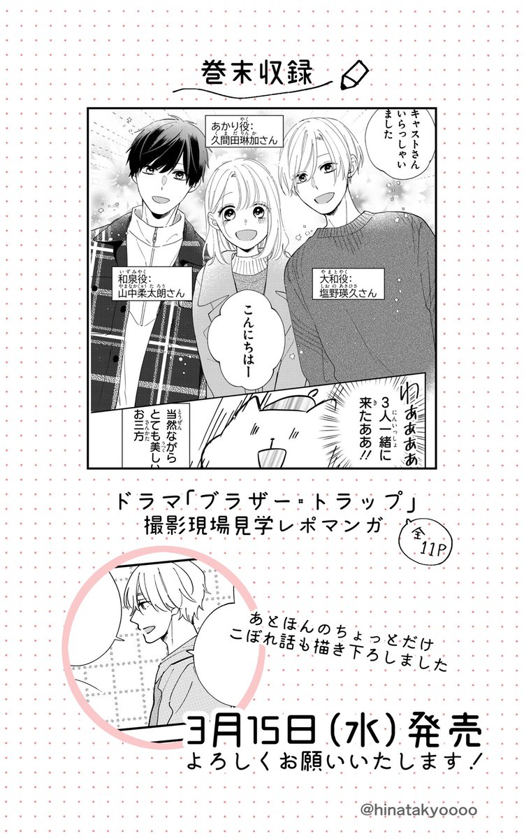 本日LINEマンガさんでドラマ撮影現場レポ漫画が公開されました! ドラマをご覧くださったみなさまありがとうございました🍬 app-manga.line.me/app/periodic/S… イラストは内容と関係ないピクニック中の3人 #ブラザートラップ
