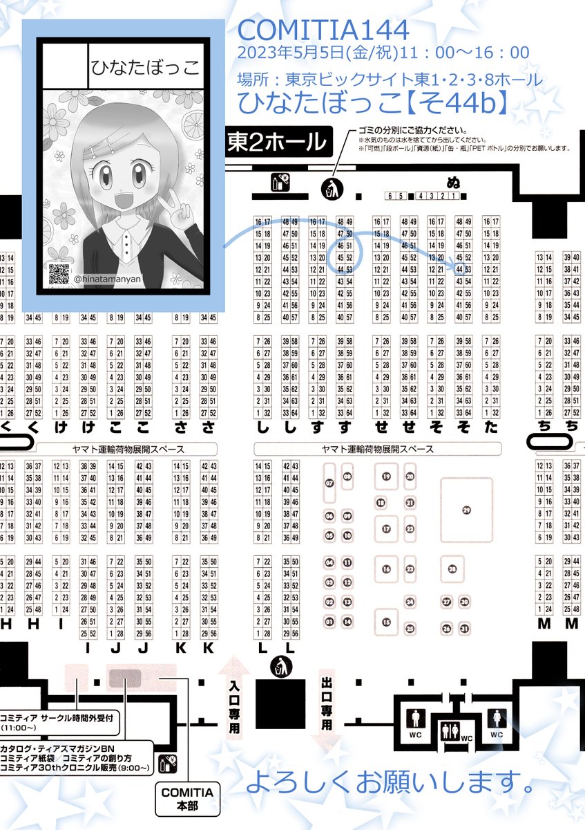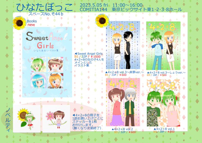 2023年5月5日開催予定の COMITIA144のお品書きです。 サークル名:ひなたぼっこ スペースNo.【そ44b】 新刊は創作漫画『4×2=8』の女の子4人をメインとしたイラスト集です。 ペーパーは来ていただいた方全員にお渡しします。無くなり次第終了。よろしくお願いします。 #COMITIA144 #コミティア144