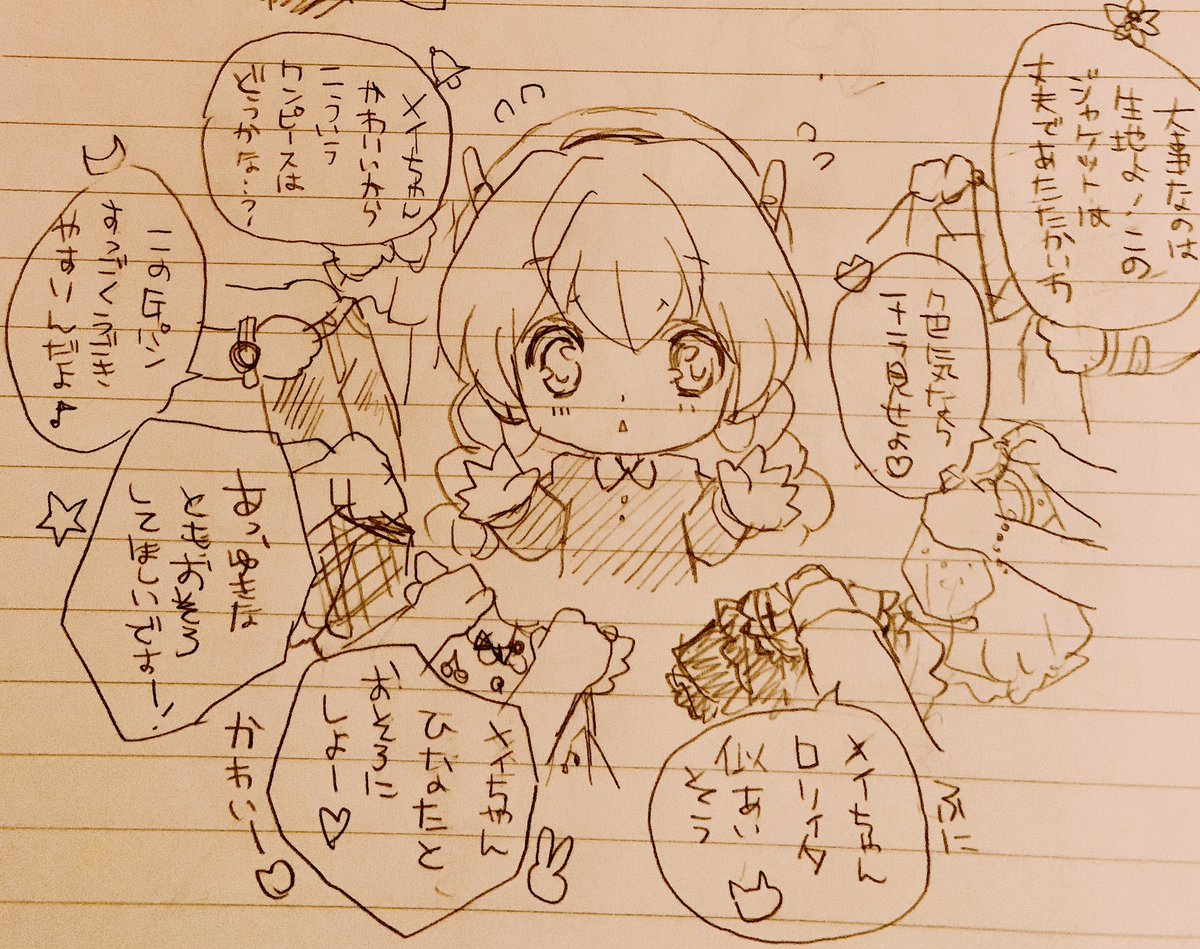 「みんな」で彩られる白🎧 メイちゃんの私服はメイちゃんっぽさを大事にデザインされますが、もしかしたらこういう背景があって「ぽくない私服」を着てるメイちゃんもいいなって思う🥰 #ひなうちのえびふり