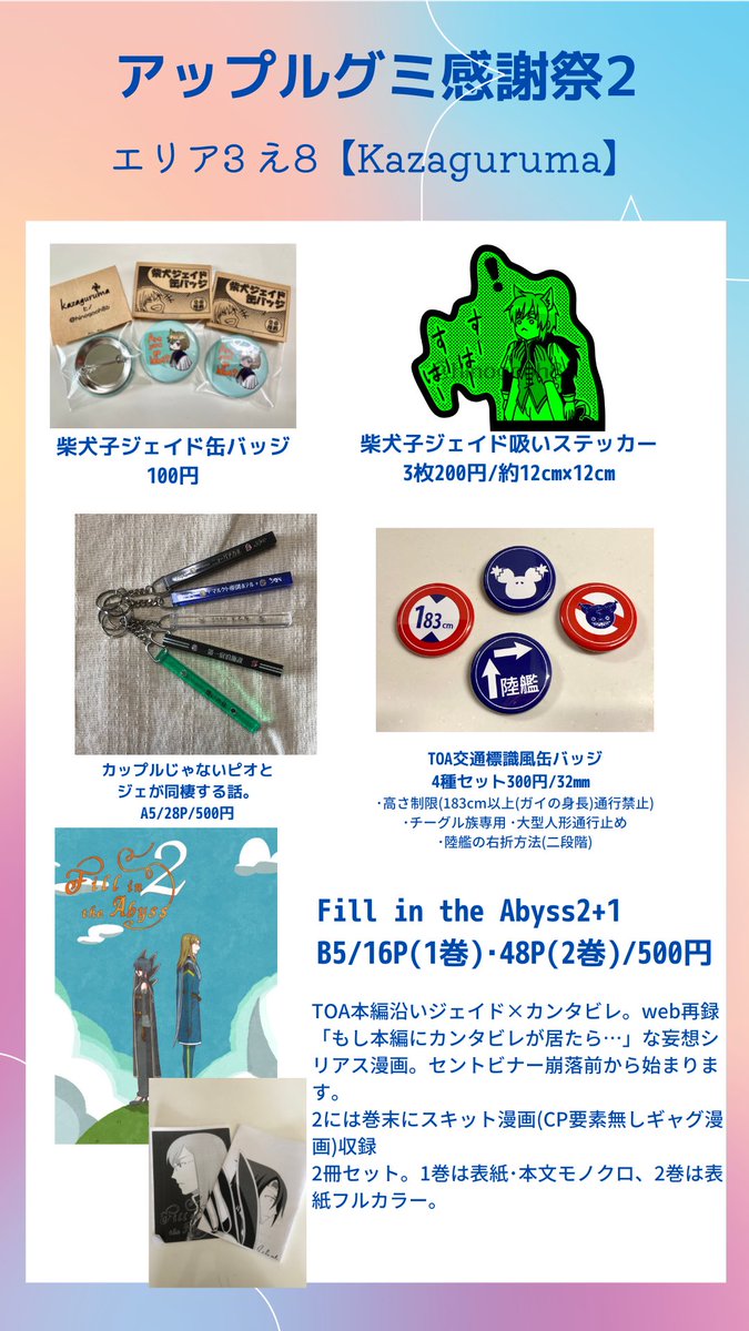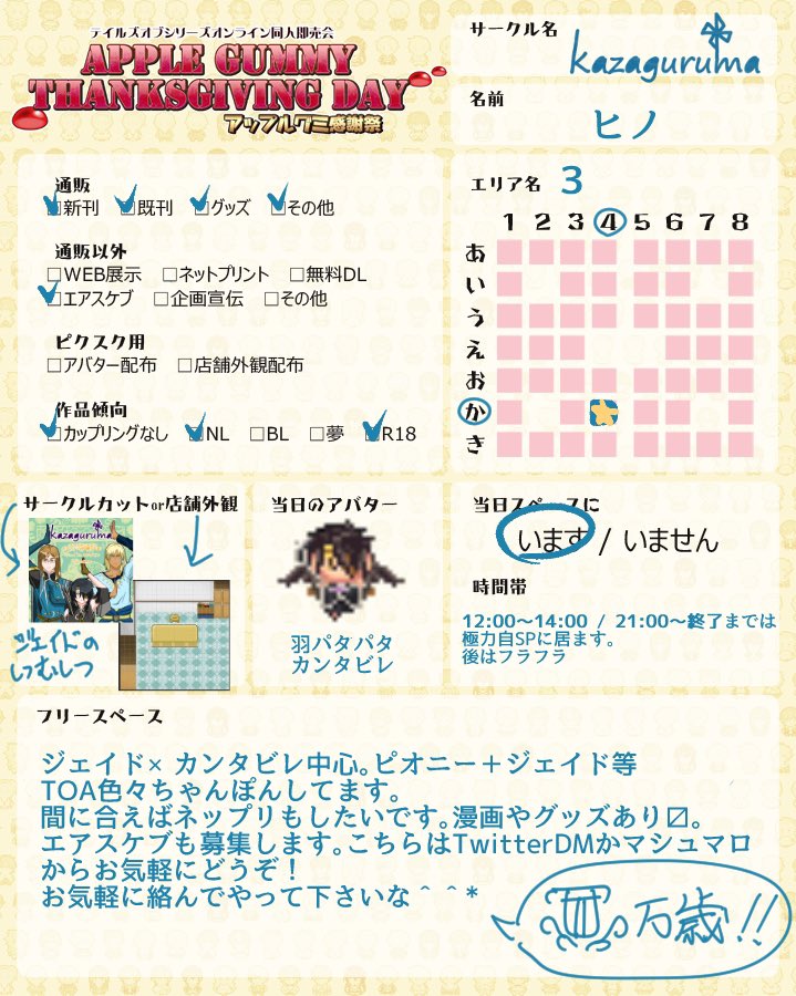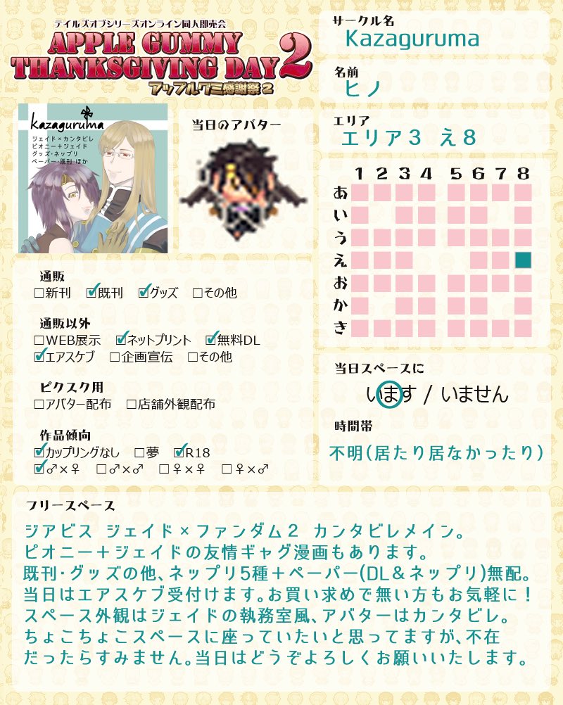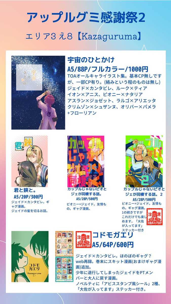 #お品書き 出来ました!ネップリの番号等はイベント直前に改めて。 画像4枚目はスペース外観です。ジェイドの執務室風。お品書きには書けませんでしたが、当日エアスケブ受付しようと思ってます。お気軽にどうぞ! #アップルグミ感謝祭2