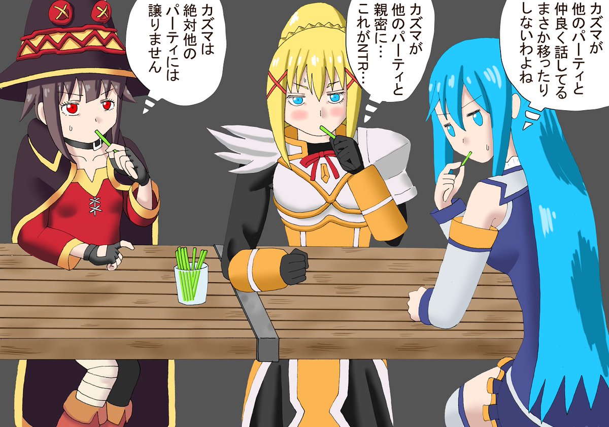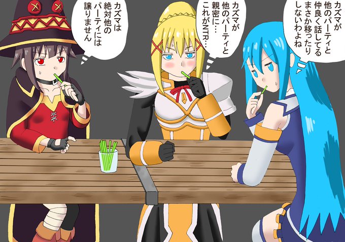 小説1巻137Pのシーンのカズマが他のパーティーに情報収集してる間、不安そうな3人 食べてるのは野菜スティックです 後ふきだしでアクアの髪の輪っかが隠れてちょっと地味になってしまいました アニメではカットされてたので描きました #この素晴らしい世界に祝福を #このすば #めぐみん twitter.com/i/web/status/1…