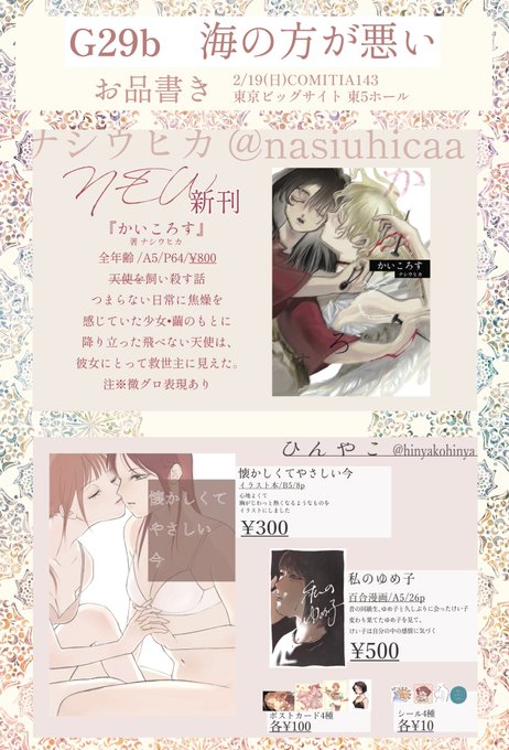 お品書きです!イラスト本と百合漫画を出します! 2/19(日)#COMITIA143 東京ビッグサイト東5ホール【G29b】 @nasiuhicaa さんと参加します! #イラスト #絵描きさんと繫がりたい #冬の創作クラスタフォロー祭り #絵柄が好きって人にフォローされたい #百合漫画 #百合 #創作百合
