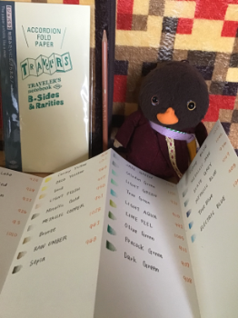 トラベラーズノートの蛇腹リフィルでやりたかったのがコレ❗️手持ちの色鉛筆の色一覧作成❗️カリスマカラーはイーグルカラー&プリズマカラー時代を経て、色表記も大文字だったり小文字だったり💦廃盤もあったり💦。イーグルカラーのフレッシュのプリントが消えてしまい、現行何かわからない💦 #色鉛筆