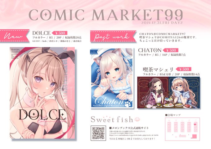 20 36 【#C99】COMIC MARKET99 12/31(金) DAY2 のお品書きです。 西こ−18b Sweetfish でお待ちしてます✨ 寒いと思うので気を付けてお越しください! 21/12/28 20:44