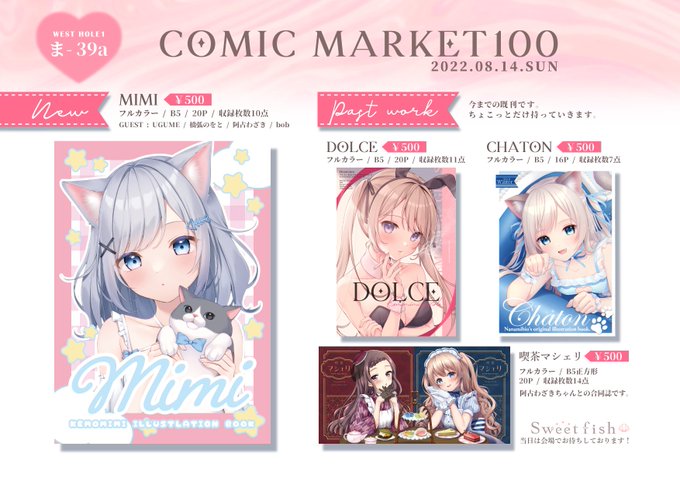 【 COMIC MARKET100 】 08/14( 日 ) DAY2 のお品書きです🕊️ 西ま-39a Sweetfish でお待ちしてます✨ 体調や天候に気をつけてお越しください🥰 #C100 #C100お品書き