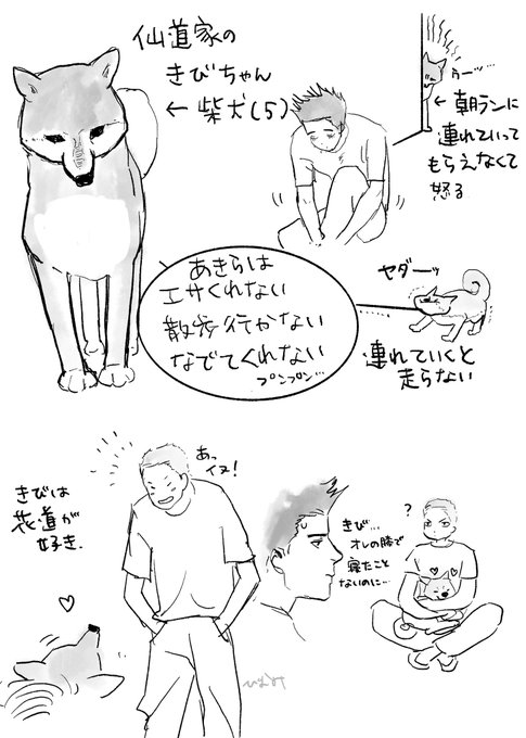 2 33 もぐおさんに設定をお借りした🦔家の飼い犬きびちゃん(柴)と🦔の関係について描きました。 とても気が強いきびちゃん…部活で忙しい🦔とはそりが合わない… 23/07/23 08:12