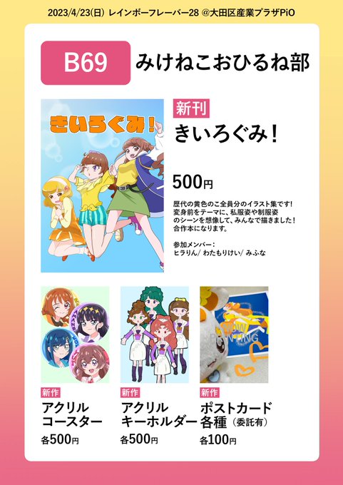 15 39 4月23日(日)のレイフレ28 初参加! スペース B69 で出展します! お品書きです! 黄色の子全員分の合作イラスト本を出します!僕はほまれちゃん等を描きました⭐️ 他にもオダマキさんの色紙やふろしきさんのポストカードの委託等もあるので、是非手に取ってご覧下さい! よろしくお願いします! 23/04/06 21:05