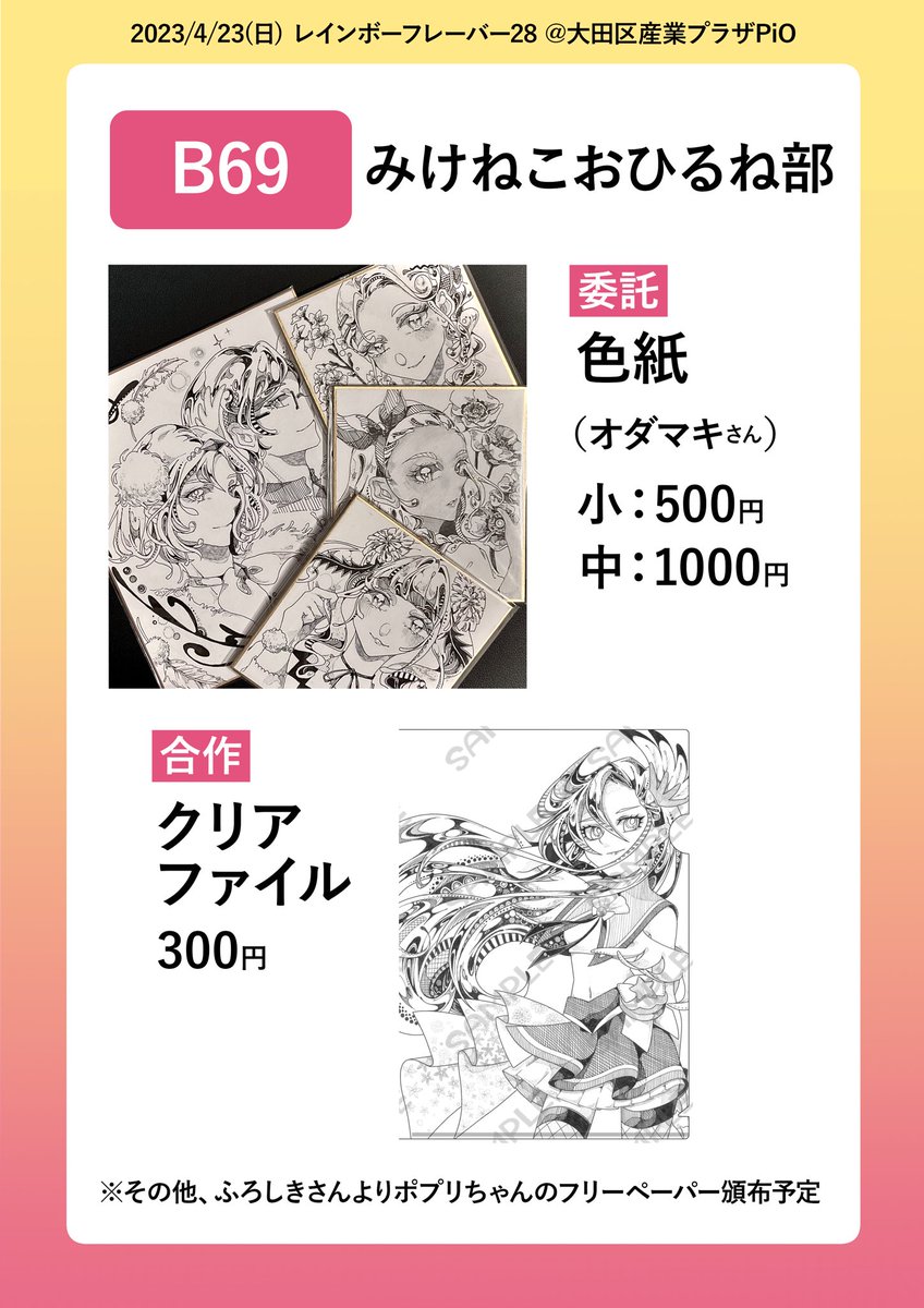 4月23日(日)のレイフレ28 初参加! スペース B69 で出展します! お品書きです! 黄色の子全員分の合作イラスト本を出します!僕はほまれちゃん等を描きました⭐️ 他にもオダマキさんの色紙やふろしきさんのポストカードの委託等もあるので、是非手に取ってご覧下さい! よろしくお願いします!