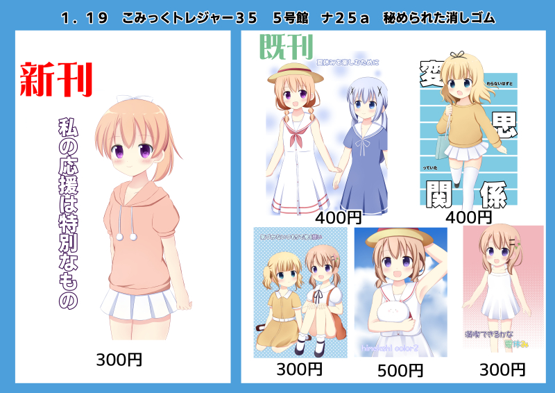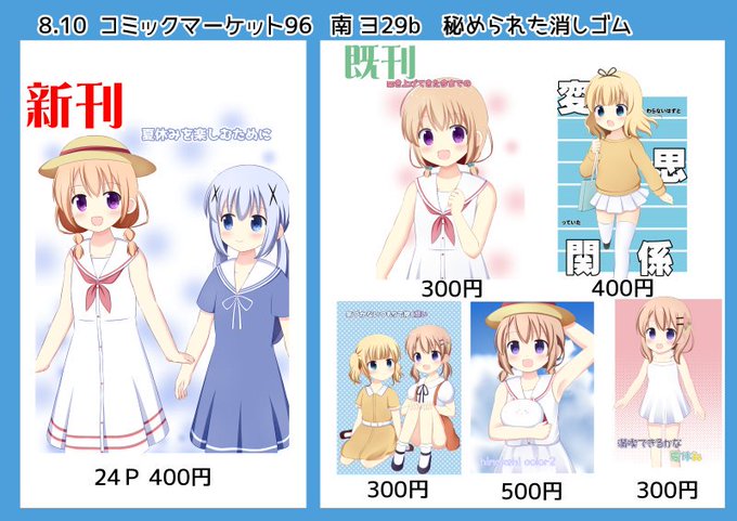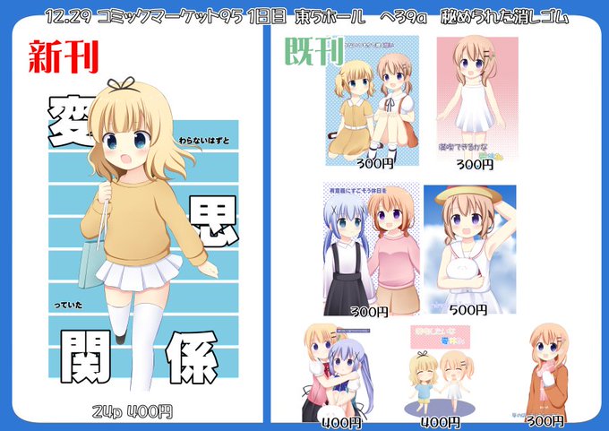 こちらがC95のお品書きになります! 新作はごちうさ本、ココシャロメインの本です。 当日はどうぞよろしくお願いします!!