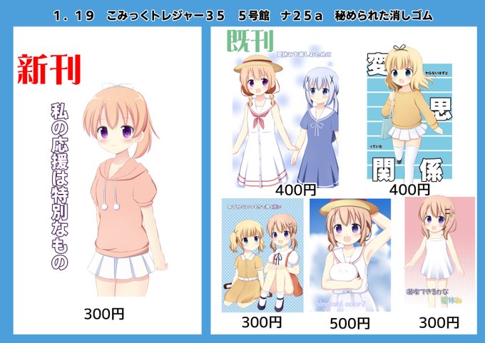 ◎あなたのサークル「秘められた消しゴム」は、土曜日 南地区“ヨ”ブロック-29b に配置されました。 無事スペース頂けました!ごちうさ本出します。 どうぞよろしくお願いします!
