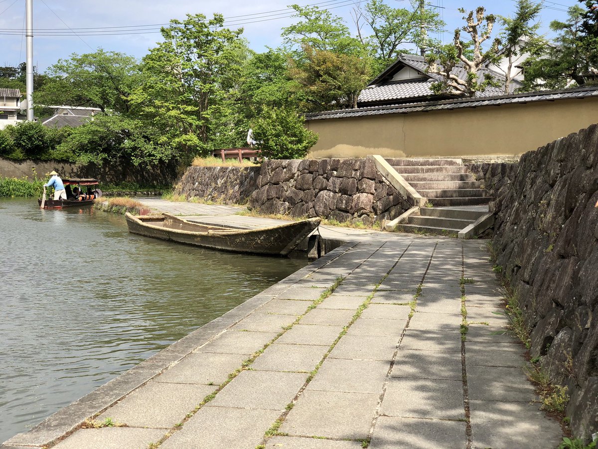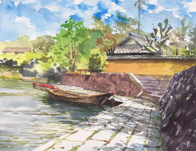 1 38 2019.5.19 近江八幡でスケッチ、2枚目。 八幡堀に浮かぶ舟。 , いつもの6色ではなく、3原色 3色だけで描いてみた。 . F6、ウォーターフォード ホワイト、透明水彩。3時間。 . #風景画 #透明水彩 #スケッチ 19/05/19 20:45