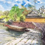 2019.5.19 近江八幡でスケッチ、2枚目。 八幡堀に浮かぶ舟。 , いつもの6色ではなく、3原色 3色だけで描いてみた。 . F6、ウォーターフォード ホワイト、透明水彩。3時間。 . #風景画 #透明水彩 #スケッチ