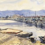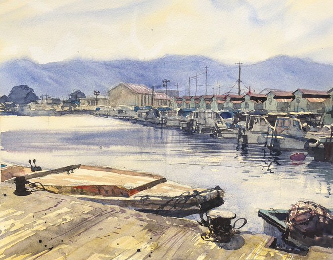 4 40 2019.5.12 堅田漁港をスケッチ。 . 北側の突堤から船溜まりに並ぶ漁船とちょっと面白い形の作業小屋を描きました。 下描き、3回描き直して1時間。 . 滋賀県大津市本堅田 . F6、ウォーターフォード ホワイト、透明水彩。3時間10分。 . #水彩 #スケッチ #watercolor #sketch #漁港 19/05/12 19:25