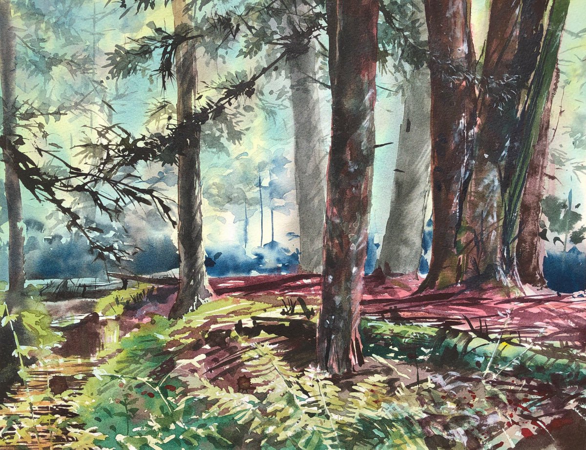 2019.8.10 信州で水源の森をスケッチ。 . 恩師にお誘いいただき、長野県八ヶ岳の裾野の富士見町へスケッチ旅行。 . この日2枚描いた、1枚目。 . F6、ウォーターフォード ホワイト、透明水彩 三原色。3時間50分。 . #風景画 #透明水彩 #スケッチ