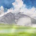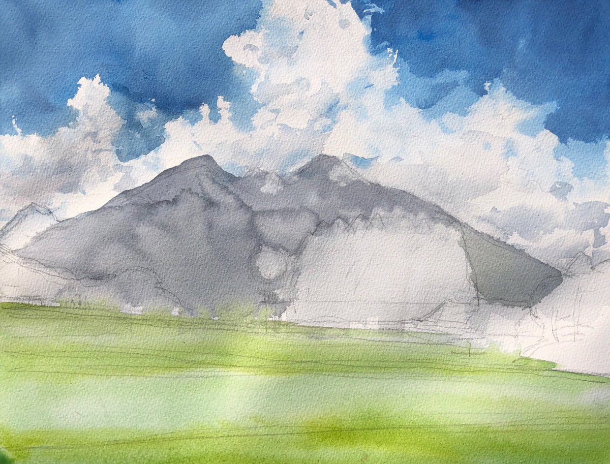 2019.8.10 八ヶ岳と夏雲をスケッチ。 . 長野県八ヶ岳の裾野の富士見町へスケッチ旅行。 . この日2枚描いた、2枚目。 . 刻々と形を変える夏雲。強烈な光に輝いて凄くパワフルな造形。 . F6、ウォーターフォード ホワイト、透明水彩 三原色。1時間45分。 . #風景画 #透明水彩 #スケッチ