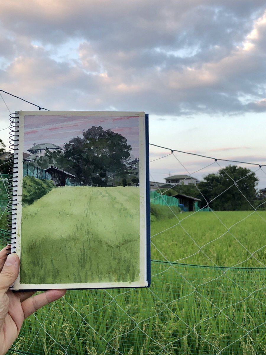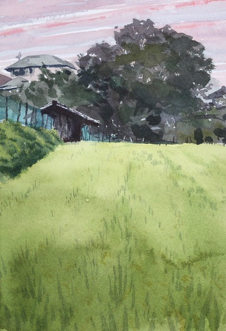 1 24 2019.8.16 坂本の農具小屋を黄昏スケッチ。 . 比叡山の麓に散在するゆるやかな小さな棚田。雰囲気のある農具小屋も残っているけど、だんだん朽ちてなくなっていく。 . 滋賀県大津市坂本5 SM、ウォーターフォード ホワイト、透明水彩 三原色。70分。 . #風景画 #スケッチ #透明水彩 #三原色 19/08/16 19:41