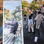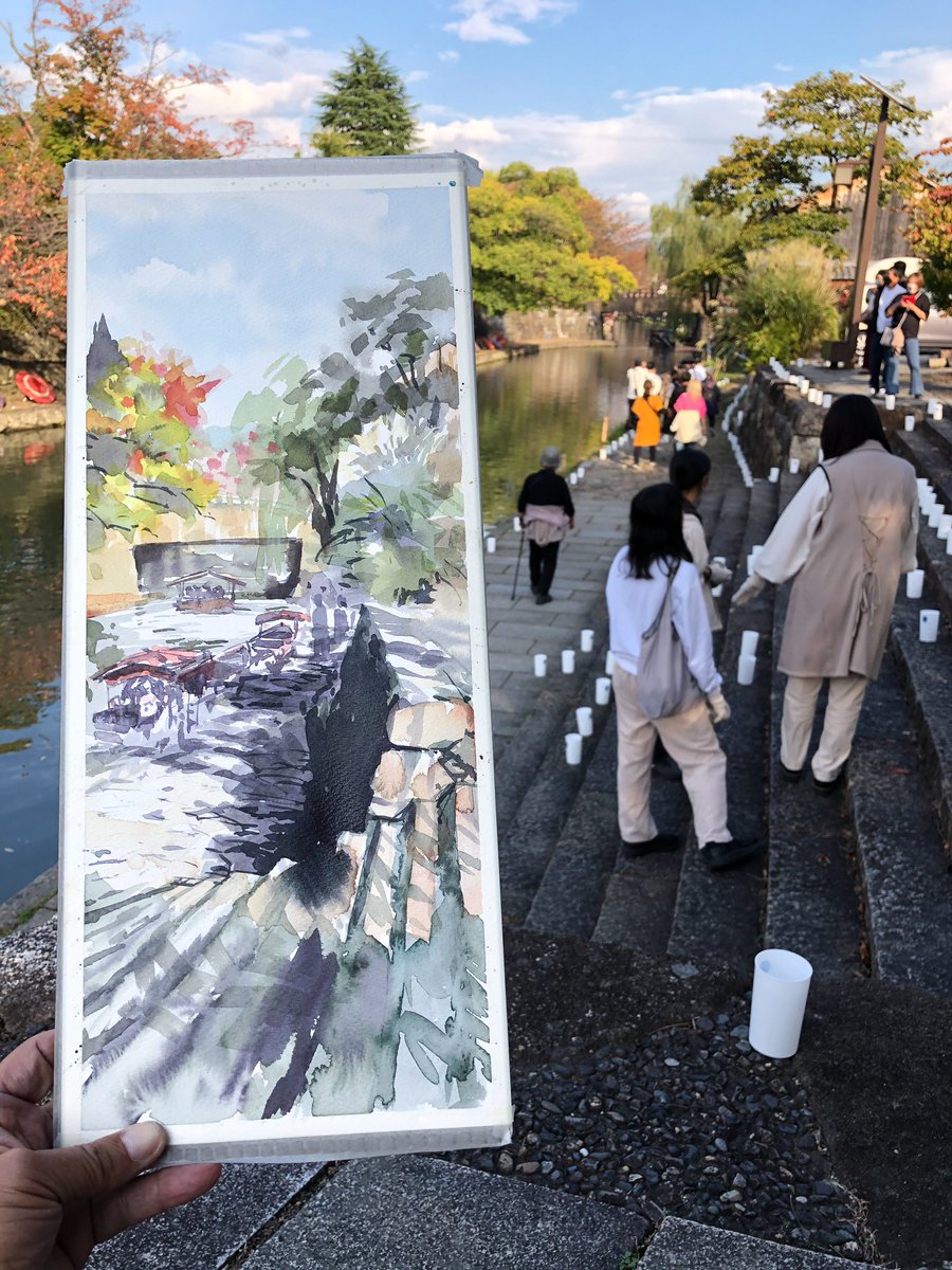 1 18 2022.10.22 近江八幡写生会。2枚目。八幡堀の船着場、新町浜から明治橋を望むスケッチ。 . 八幡堀まつりのランタンの準備などが始まって、人がいっぱい。 . テキトーに歪めて描いてみた。でもあんまり遊べてないなー。 . 440×190mm(F8ハーフ)、アヴァロン紙、透明水彩(三原色)。1時間30分。 22/10/22 21:55