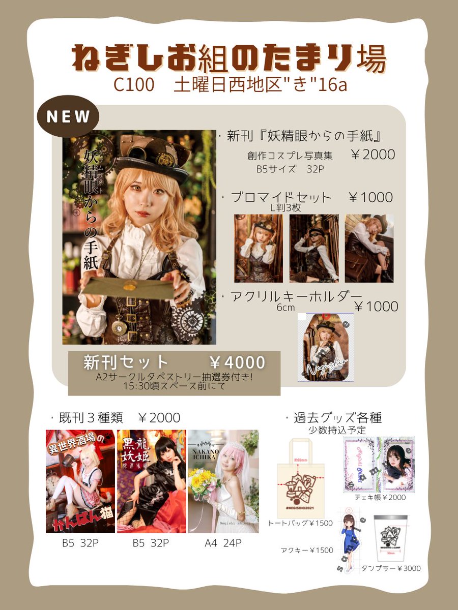 3 29 根岸しおりさんの創作コスプレ写真集撮影致しました! 夏コミ来られる方は是非お立ち寄りください! 既刊の中野一花ウエディング写真集も撮影しておりますのでこちらもお手に取って頂けますと! #C100お品書き twitter.com/negishio_lv/st… 22/08/08 15:04