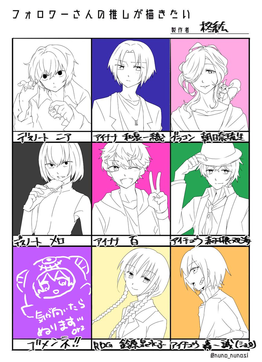 ごめんなさい。遅くなりました。そして力尽きました…線画で許してください…。なんなら塗ってください…。 ちなみに和泉一織は前にむさんにお返しできなかったから勝手に描きました。 #フォロワーさんの推しが描きたい