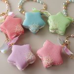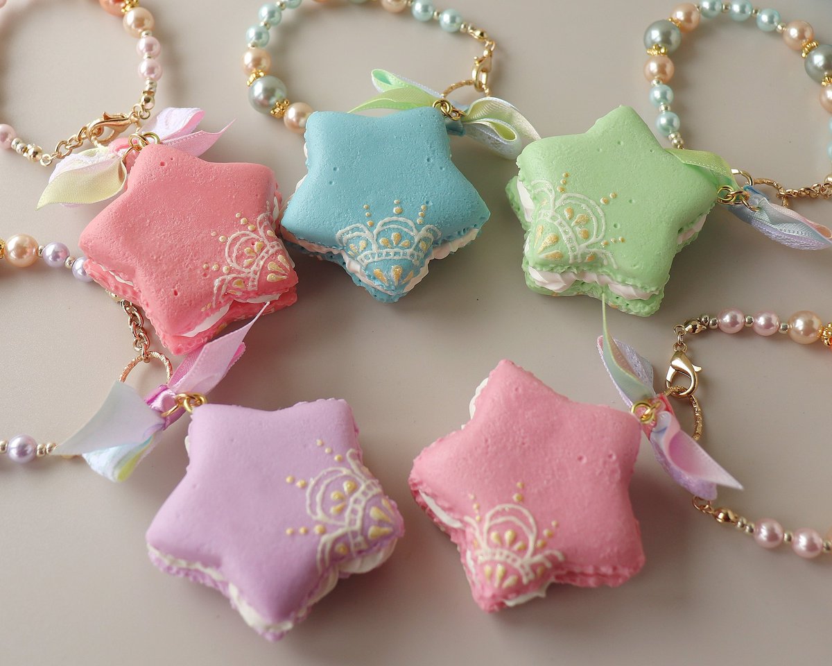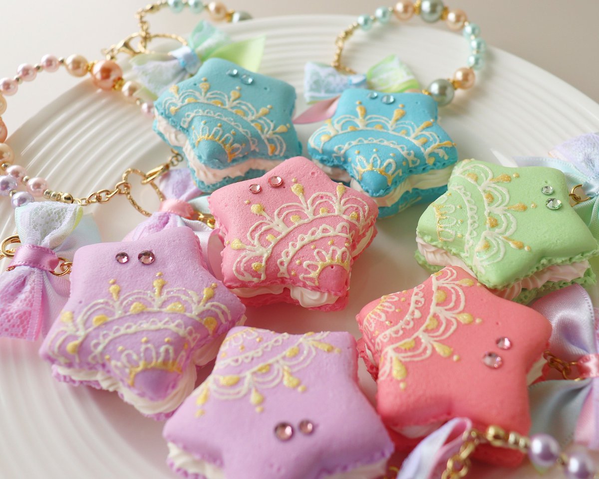【お品書き その⑥】 お星さまマカロン にこにこ雲 お星さまマカロンはバッグチャームとリングをお揃いで作りました。バッグチャームは裏側もレースを描きました♡ 今回は無性にレース描きたいモードでした。 にこにこ雲さんは、ほんわか楽しく制作しました( *´ー`)