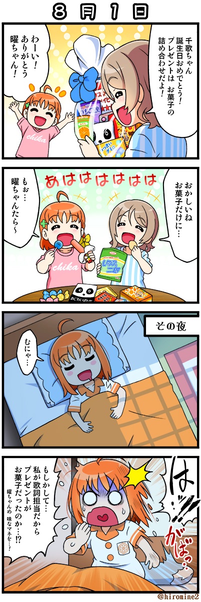 千歌ちゃん誕生日おめでとう( ´ ▽ ` )🎂🎁🎉🎉🎉 今年もこの4コマでお祝いわい🍊⚓️🥂 幻ヨハ効果で ますますAqoursや沼津が盛り上がっていって欲しいです😇 そして また 楽しいラジオドラマの新作を聴きたいです☆ #高海千歌生誕祭2023 #高海千歌誕生祭2023