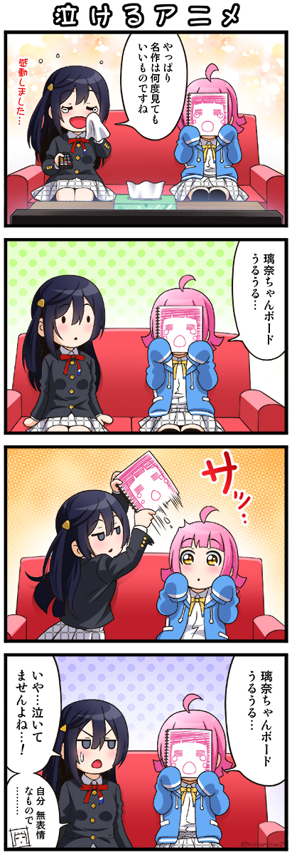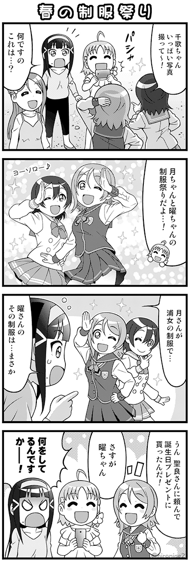 今月に入って ずっと頭の中に浮かんでいた穂乃果ちゃんと千歌ちゃんのやりとりを以前描いた4コマにセリフを充ててみました。 作品の垣根を超えて みんなが楽しく交流する世界が大好きで 自分の4コマもスクスタ世界線で描くようになりました。 ありがとうスクスタ(^▽^)🌈✨ #ありがとうスクスタ