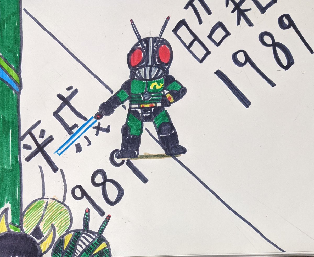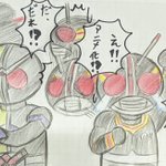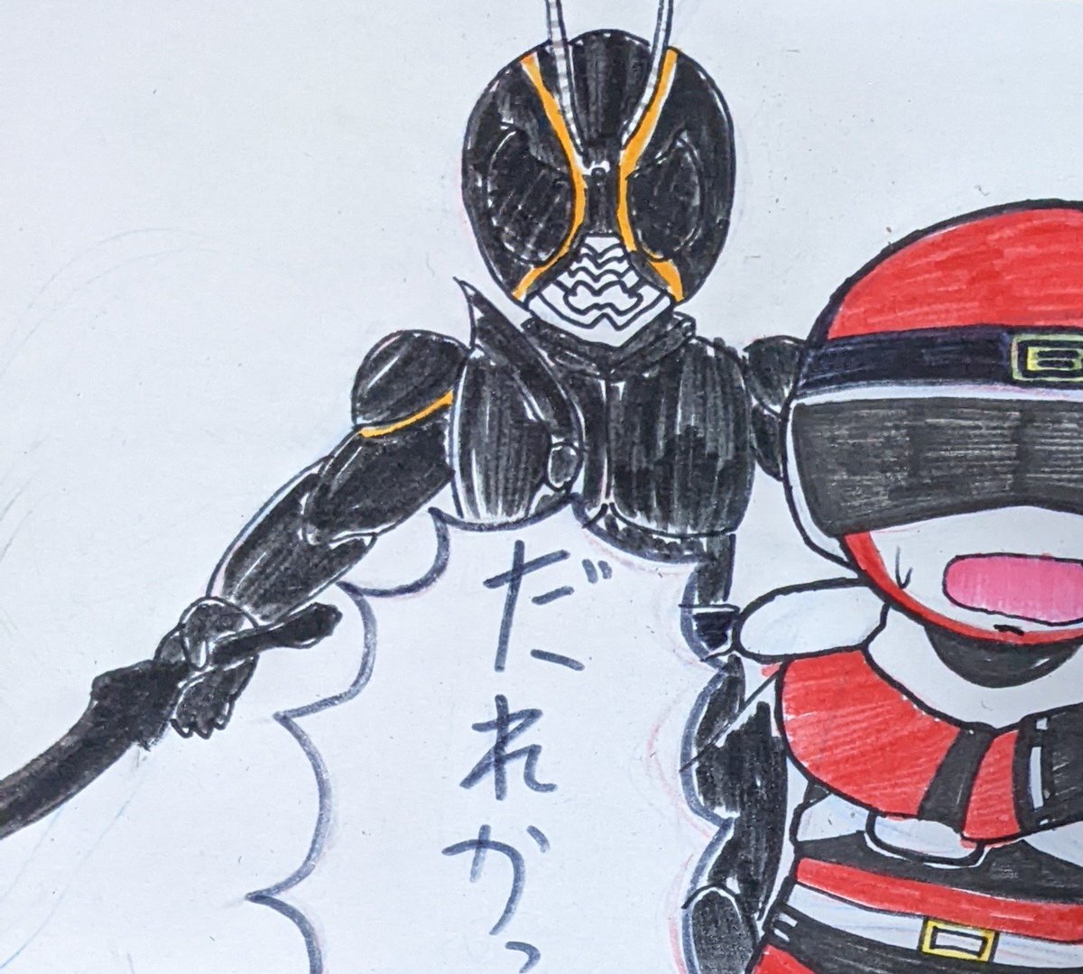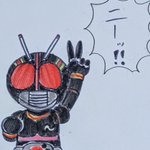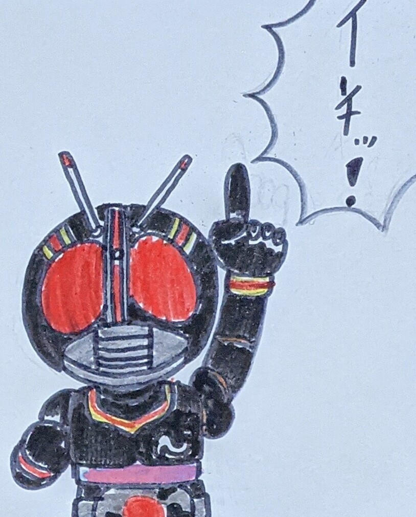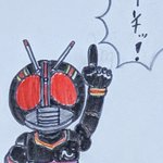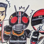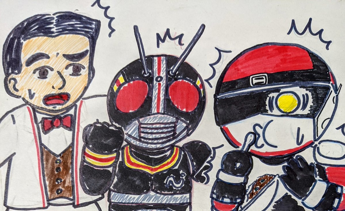①仮面ライダーblackSun ②バイクロッサーケン 石ノ森ヒーローの「兄弟」拳として兄弟同然で仮面ライダーなだけでリメイクされた事にガツンと言ってやろう思ってたらいきなり左の肩の何かもぎって剣にするモンだから・・ #特撮版深夜の真剣お絵描き60分一本勝負R