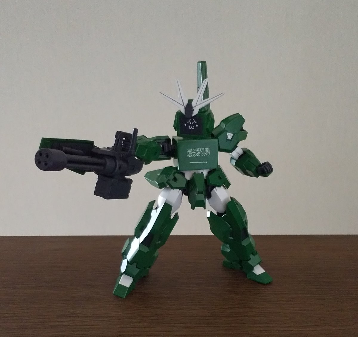 オリジナルガンプラのサウジアラビアversionです。大型のガトリングガンを装備した機体。最大の特徴は「パーメット」と呼ばれる材質で機体の一部が構成されており、パーメットスコアをあげると機体性能が向上する。(という設定)(´・ω・`) #ガンプラの画像貼るとRTされると聞いて #サウジアラビア