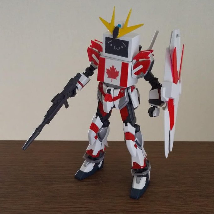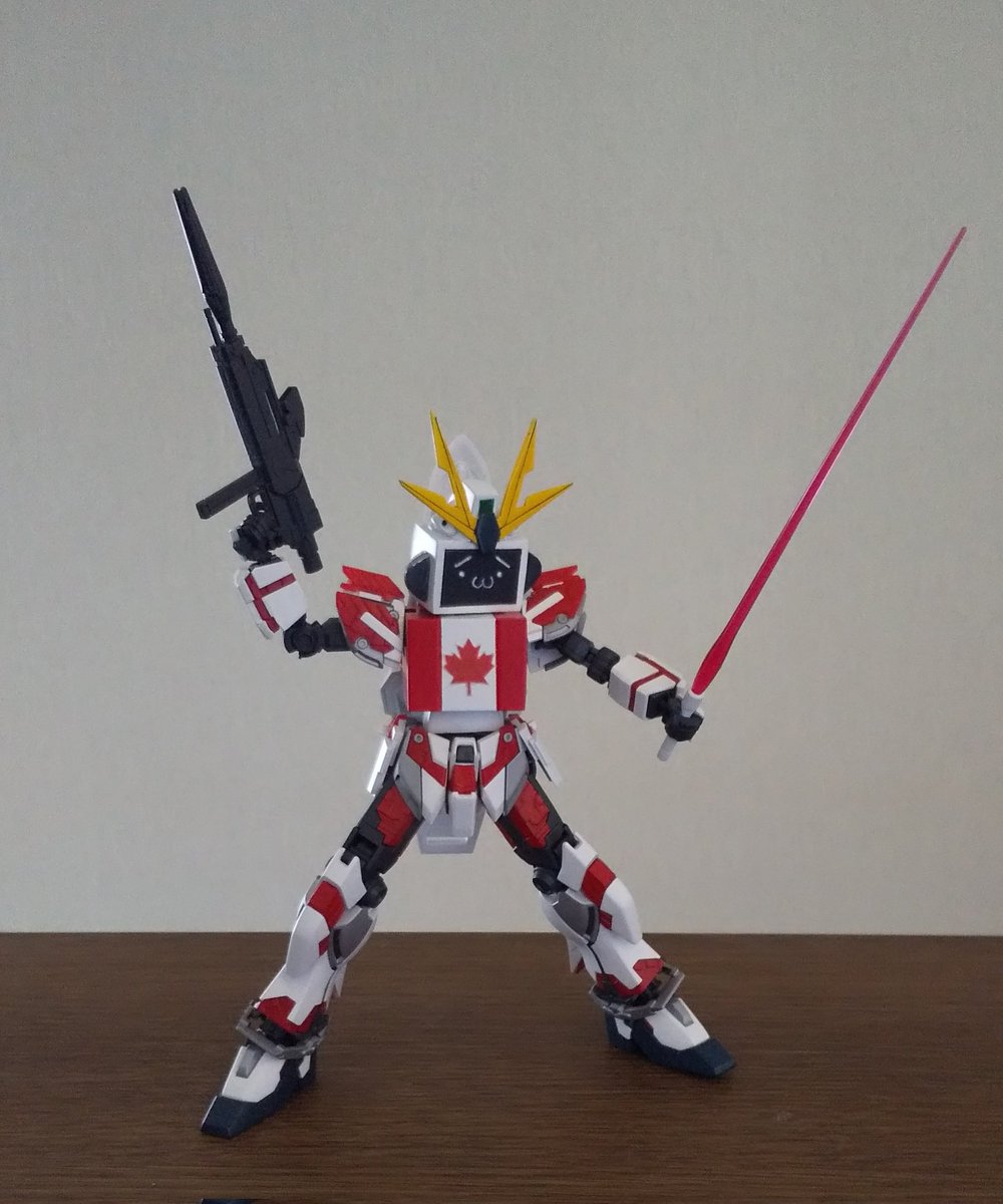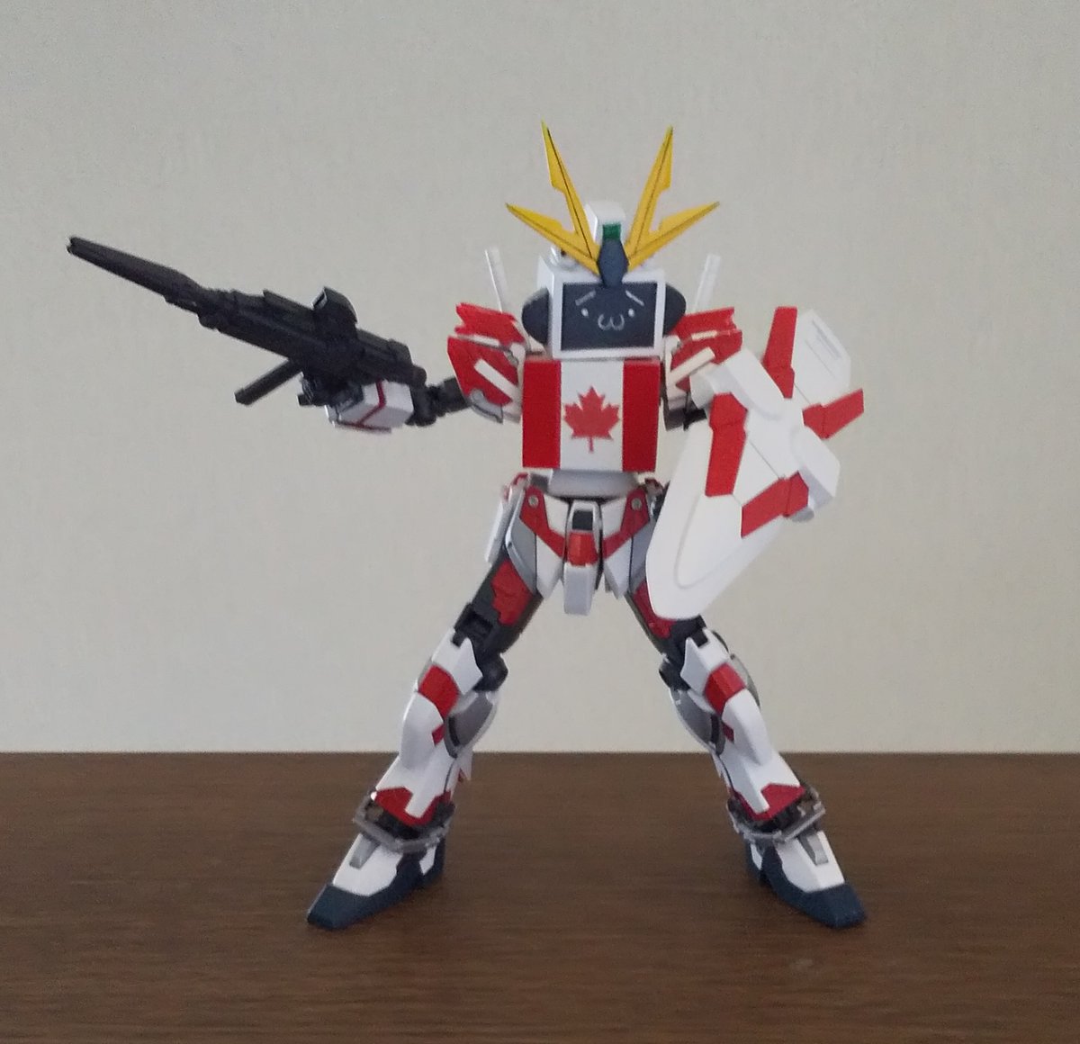 オリジナルガンプラのカナダversionです。未知のテクノロジーであるサイコフレームでおおわれた機体。個体名はメイプル。(という設定)(´・ω・`) #ガンプラの画像貼るとRTされると聞いて