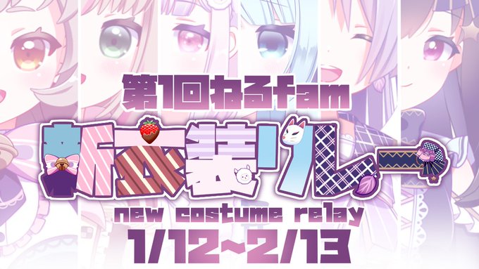 【#第1回ねるfam新衣装リレー】開催決定!(1/2) 1/12から毎週、新衣装がお披露目されます! 🌟メンバー一覧🌟 1/12 碓氷こまき @usui_komaki 1/17 甘乃あもこ @amoko_official 1/24 ぱかぴこ @paka_pico 2/1 ななしちゃん @nanashi_28 2/7 大葉しそ @obasiso 2/13 綺咲山九星くるみ @kskym9zkrm
