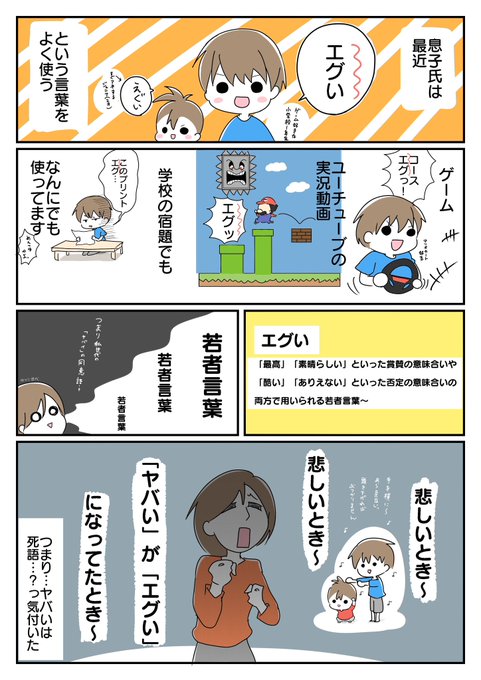 「ヤバい」と「エグい」で年代わかるかもしれないね 私なんて「ヤバい」ばっかり使ってます。銀魂アニメリアタイしてたから余計に← #育児絵日記 #育児漫画 #コミックエッセイ