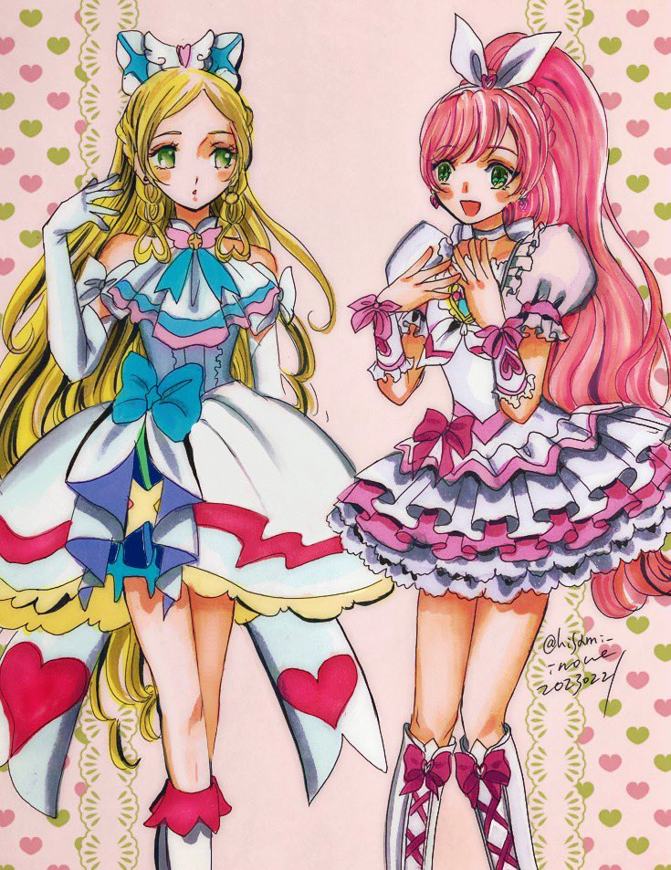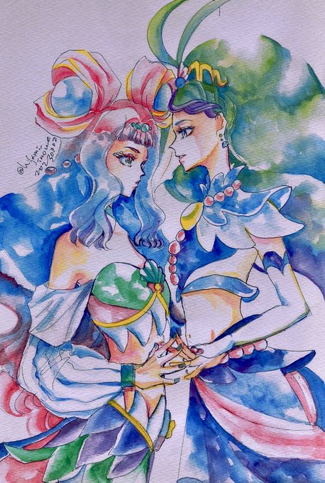 【お題:衣装交換】 2.5ドロでキュアリズムとキュアプリズム。描いてて奏スゲェ〜って思った。どう言っていいのかワカランが…何か…たおやかが過ぎる…(??) ※ミス発覚したので再投稿です。反応くださったかた有難うございました🙇♀️ #プリキュア版深夜の真剣お絵描き60分一本勝負